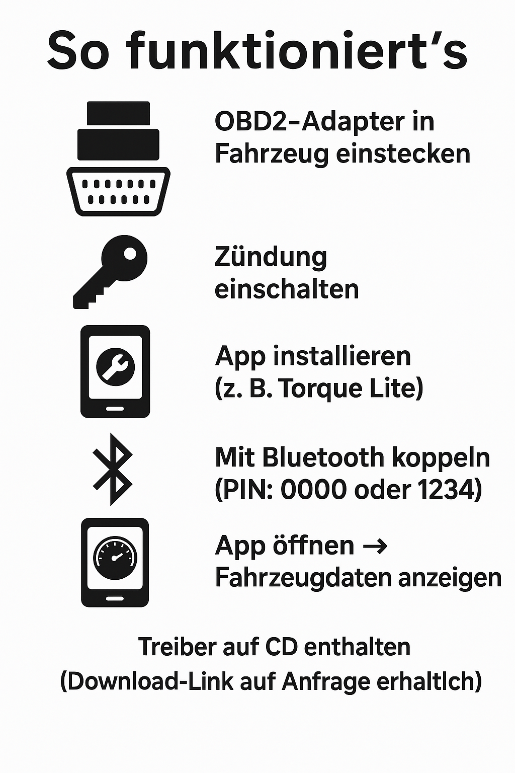 - Zur Nutzung ist eine passende App erforderlich (z. B. Torque, Car Scanner)