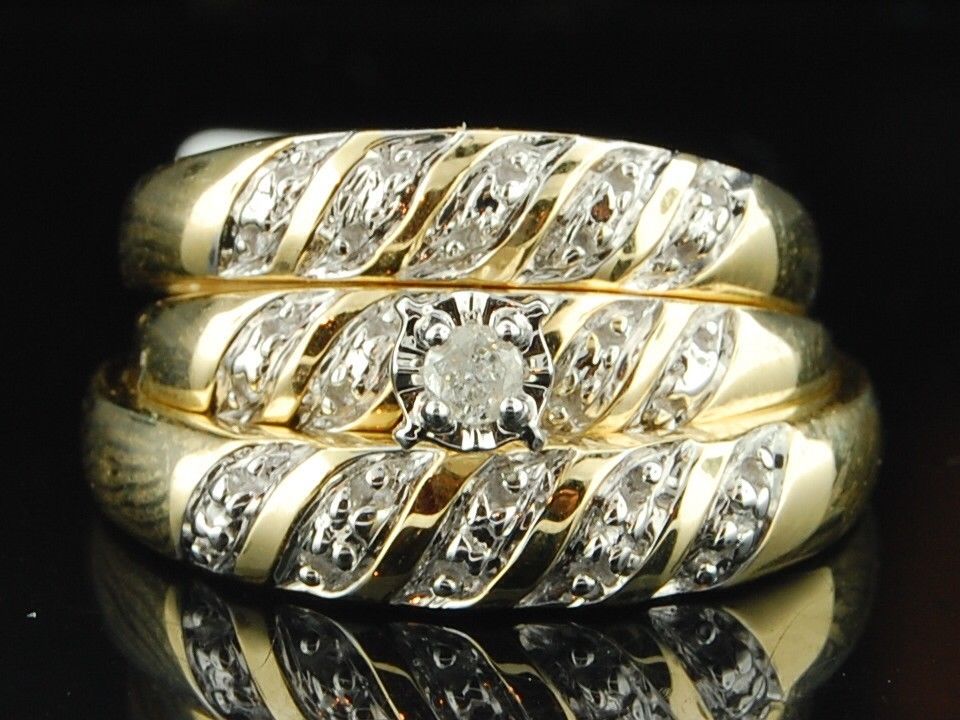 Up for auction is a very affordable priced diamond trio set. This ring is set in real 14K Yellow Gold and real round cut diamonds in prong setting. Diamonds are set close together for a uniform and clean look. The diamonds are machine set precisely to give it a clean finish.