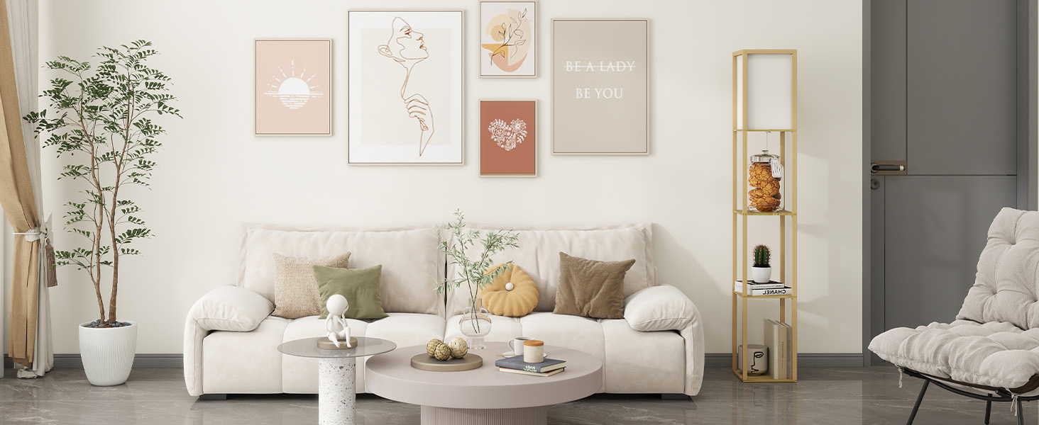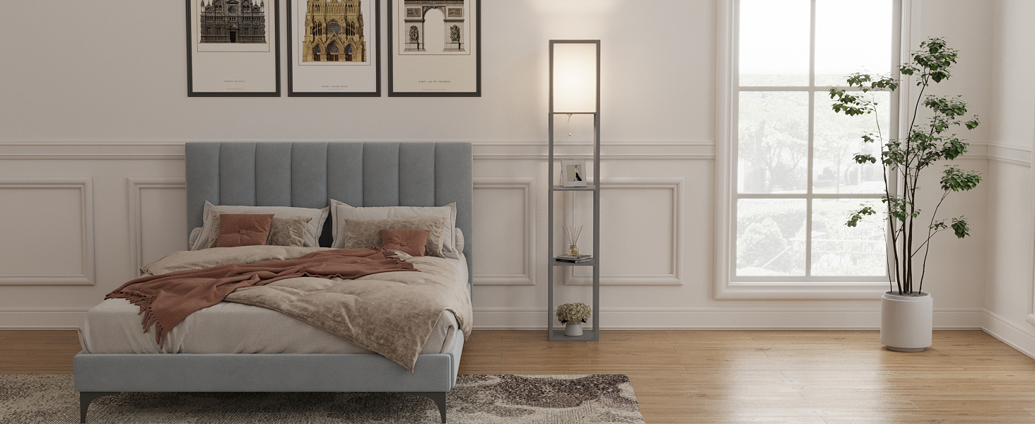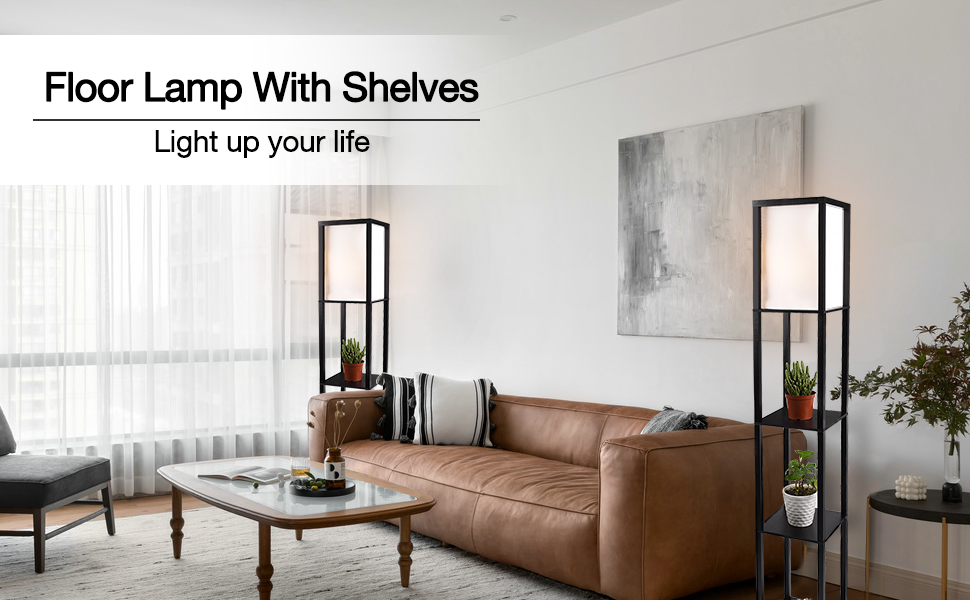 This Standing Floor Lamp is crafted of wood with veneers in a black espresso and white finish, this multi-funcational design strikes a tall, open rectangular silhouette. Three open shelves provide perfect platforms for showing off framed photos, figurines. Soft fabric shade diffuses the light just enough for a warm glow in the room.