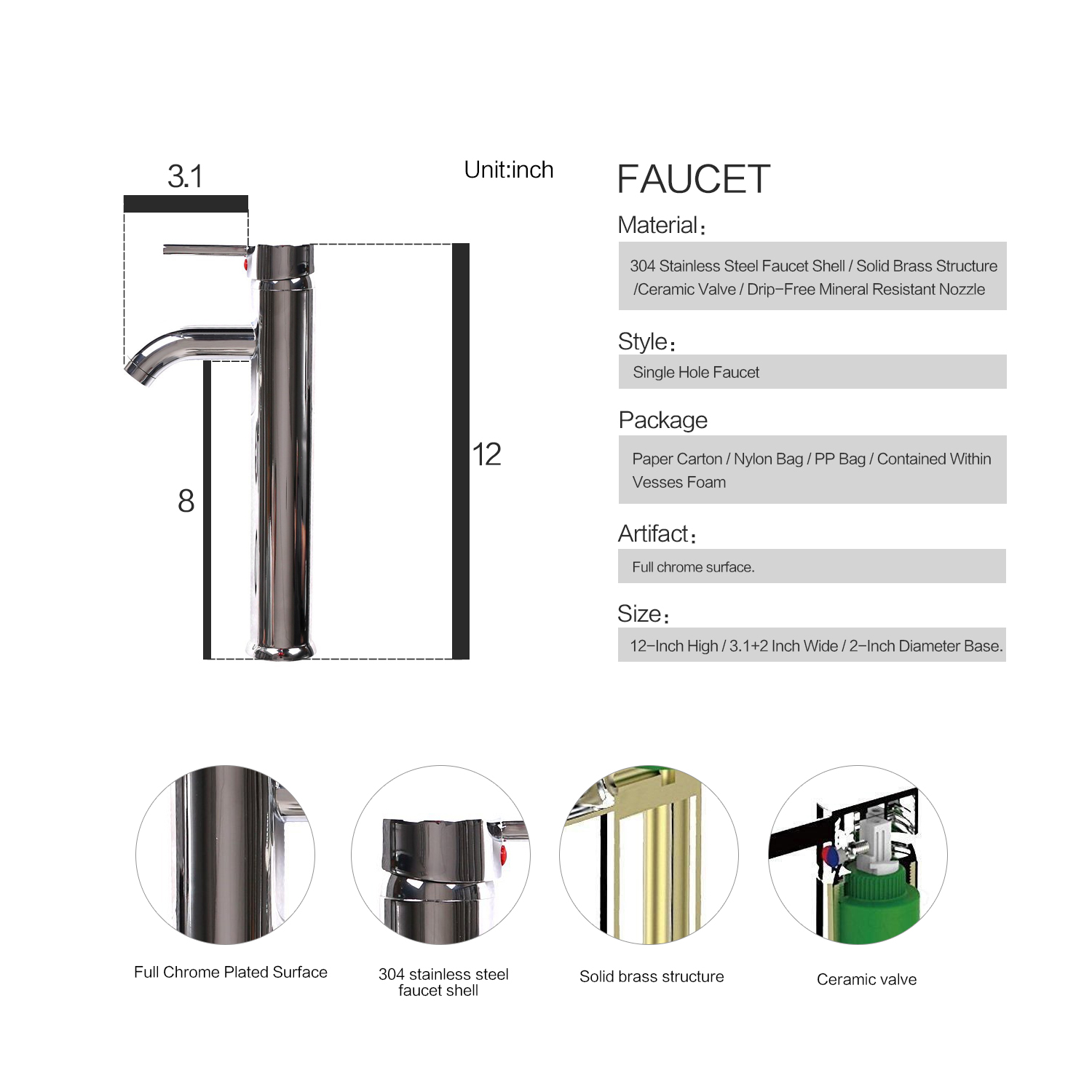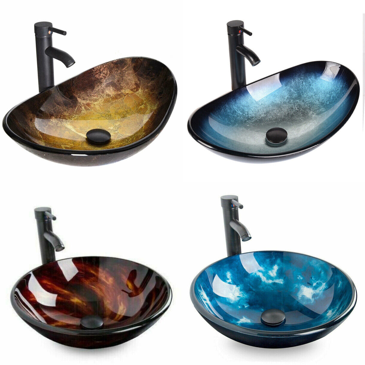 Bathroom Vessel Sink Basin Tempered Glass Ceramic Bowl Faucet Drain Basin Combo