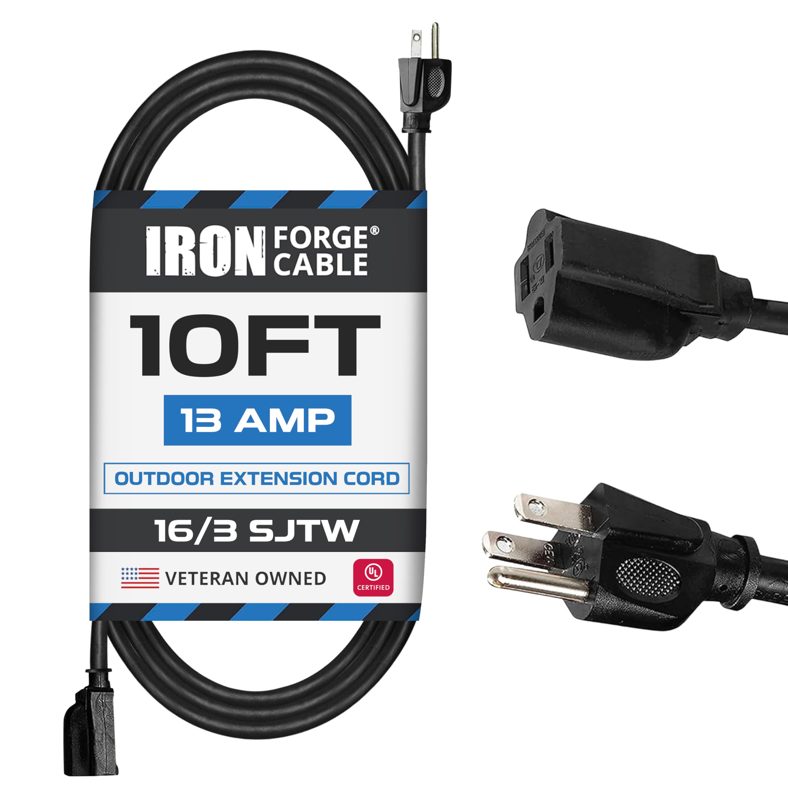 The Iron Forge Cable outdoor extension cord 10 ft is built for durability and versatility, perfect for indoor & outdoor use whether powering a leaf blower, outdoor lights decorations, landscaping, or household appliances. This 10 ft extension cord outdoor features a vinyl-covered, weatherproof design that resists moisture, snow, sunlight, and corrosion, ensuring reliable performance in any environment. With nickel-coated, reinforced blades, this 10' extension cord prevents bending and breakage, blending seamlessly into your space. UL certified for safety, the 10ft outdoor extension cord boasts 16 AWG wiring, 13 amps, 125 volts, and 1625 watts, with a temperature rating of -40¡F to +140¡F. As a U.S. veteran-owned company, Iron Forge Cable stands behind this 10 foot extension cord outdoor, offering top-tier service and reliability. Upgrade your setup with this 10ft extension cord outdoor, designed to withstand the elements and power your projects with confidence.