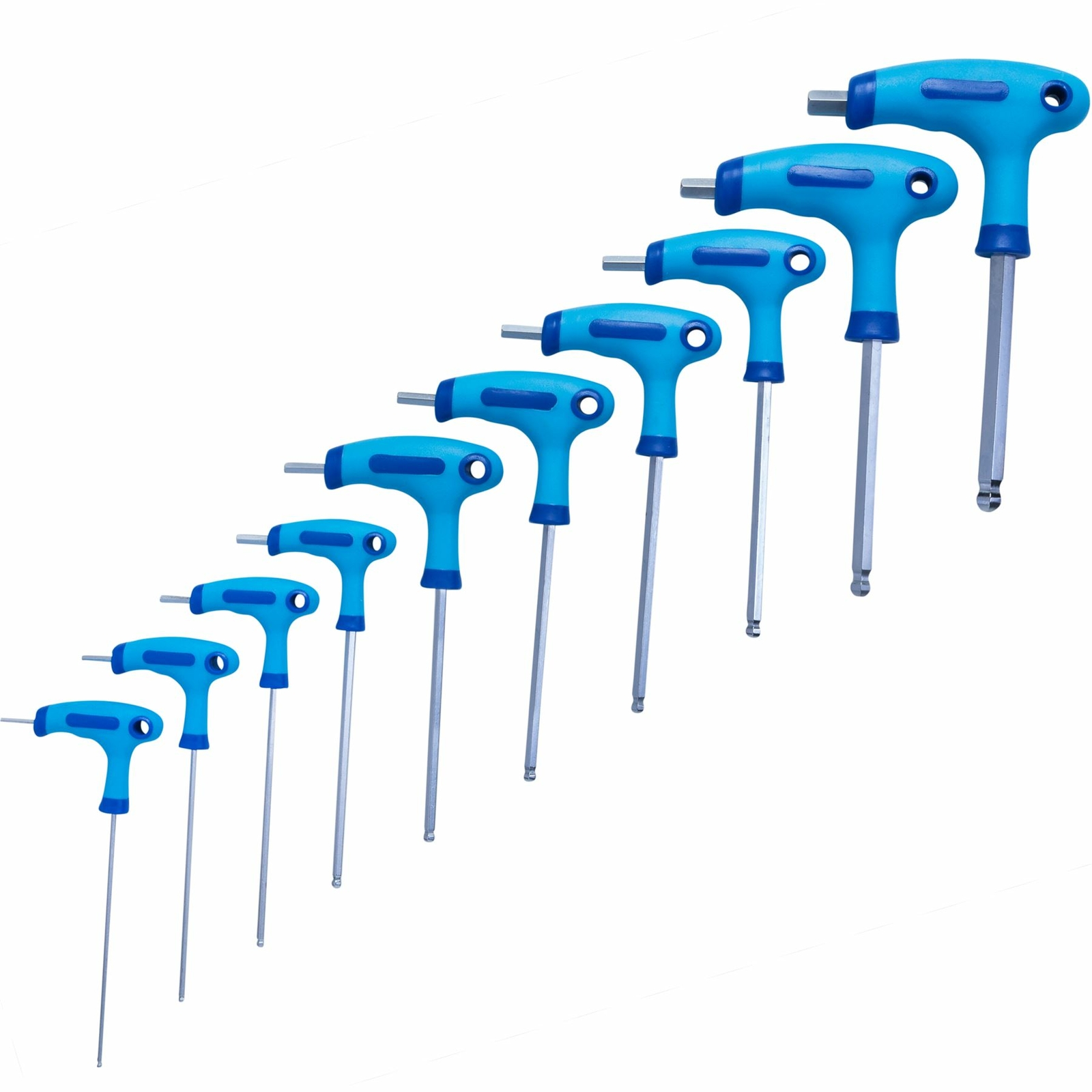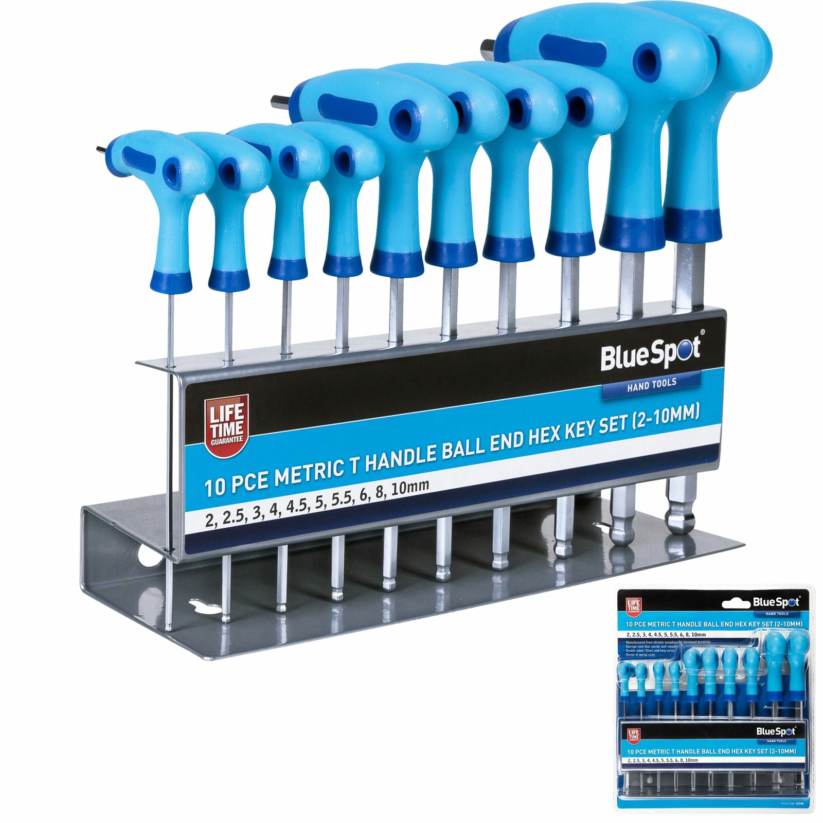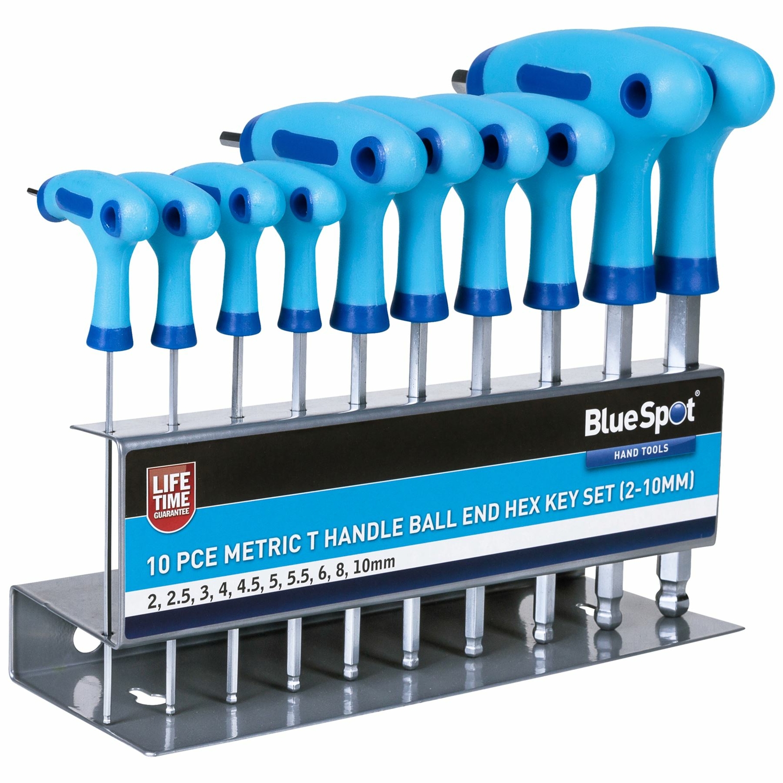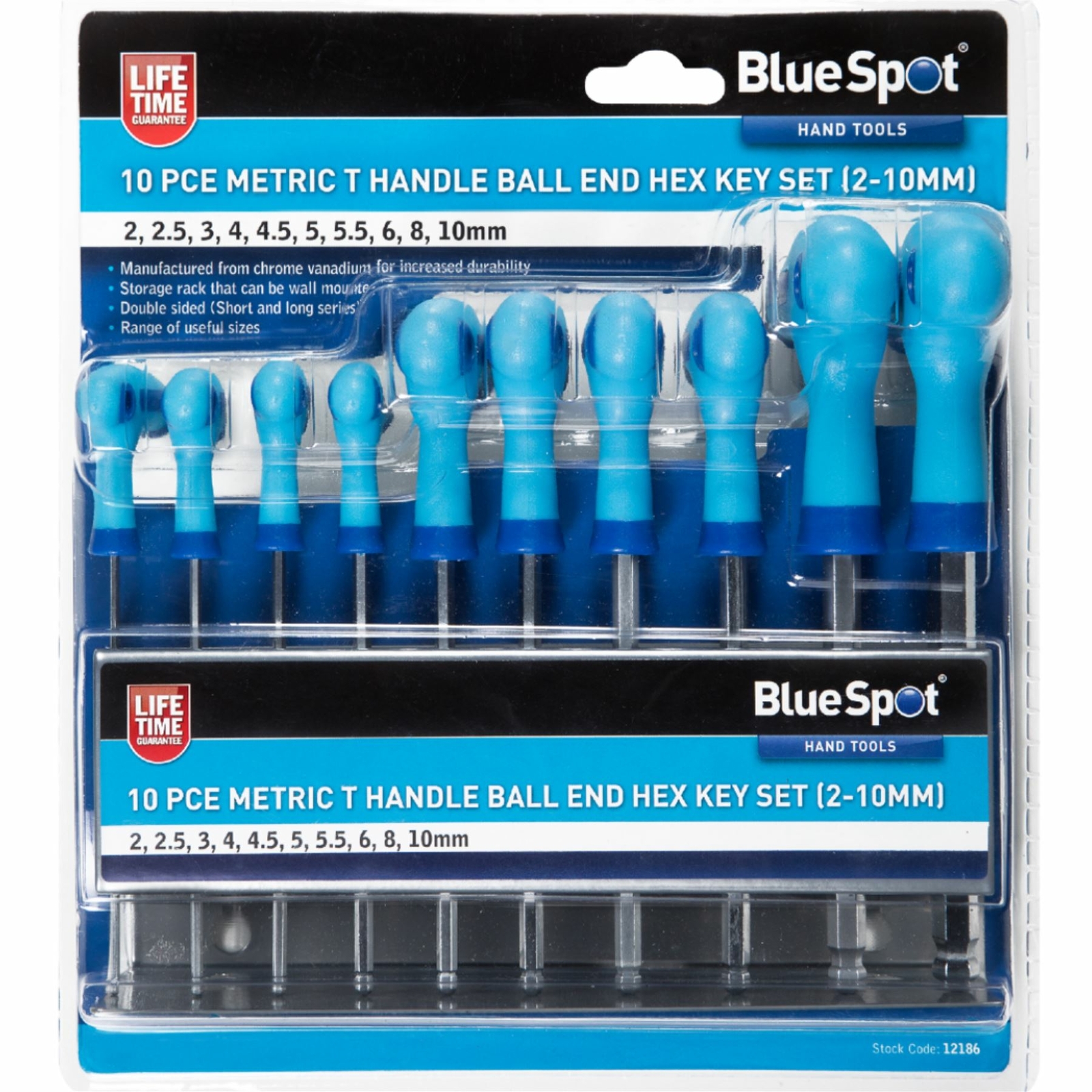 BlueSpot 10 PCE Metric T Handle Ball End Hex Key Set (2-10mm) The BlueSpot 10 PCE Metric T Handle Ball End Hex Key Set (2-10mm) is manufactured from chrome vanadium steel feature a heavy-duty ergonomic soft-grip handle. Package Contents - 2, 2.5, 3, 4, 4.5, 5, 5.5, 6, 8 & 10mm To activate the manufacturers lifetime guarantee, you will need to register the product on the Bluespot website within 30 days of purchase.