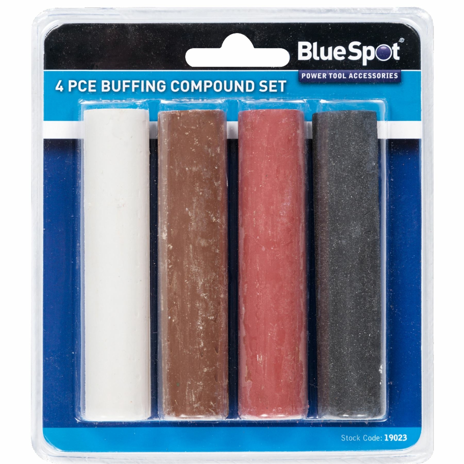 BlueSpot 4 PCE Buffing Compound Set The BlueSpot 4 PCE Buffing Compound Set contains 56g of each type and is suitable for use on a wide range of materials. The tripoli (brown) buffing compound is ideal for removing surface imperfections on brass, aluminium, pewter and other non-ferrous metals. The emery (black) buffing compound is for coarse buffing to remove scratches, rust and corrosion, and to de-burr stainless steel and other hard metals. The white buffing compound can be used on all metals to remove scratches and to obtain a highly reflective finish. The jewellers' (red) buffing compound is for fine polishing of gold, silver and other precious metals. Suitable for use on a wide range of materials. Tripoli for removing imperfections in non ferrous metals. Emery for coarse buffing and de-burring. White for a high shine finish. Red for fine polishing of precious metals.
