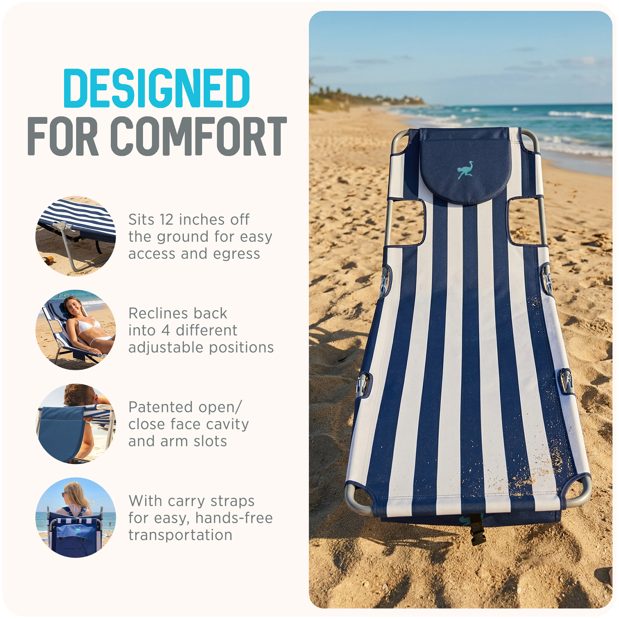 This chaise lounge chair is equipped with a patent-pending face cavity that can be opened and closed, allowing for added breathability. The convenient armholes make it easy to lie face down and enjoy a good book or use your cell phone while in that position. When it's time to flip over, simply close the lounger chair's face cavity and take full advantage of the soft head pillow.