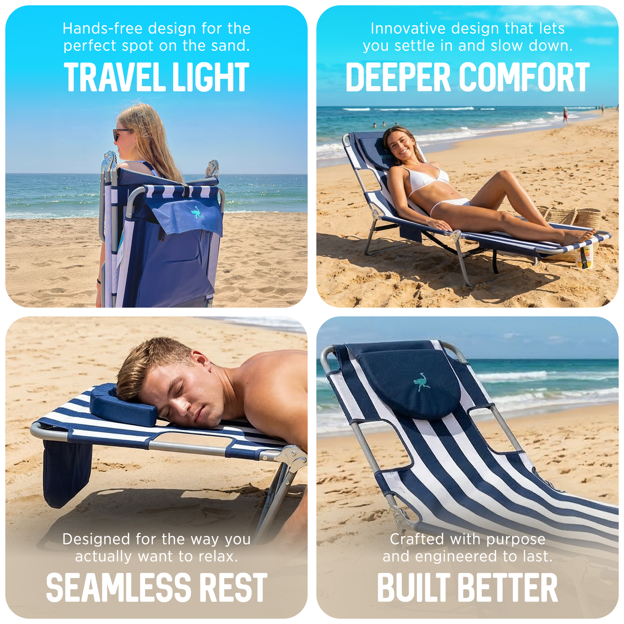 When it's time for a beach, lake, or pool day, you can easily pack up the backpack lounger and carry it with the built-in backpack-style straps. Finding the ideal spot to soak up the sun becomes a breeze. The chair's 4-position foldable frame, made of powered aluminum, adjusts to your preferences. You can recline and close your eyes for a serene moment or sit up to chat with friends.