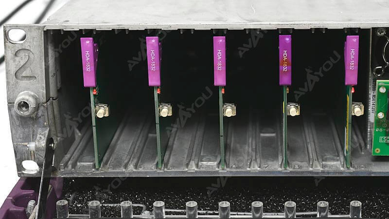 For sale is ONE (1) Miranda frame populated with (8) cards. Cards are HDA-1832 Reclocking HD-SDI DA with a double backplane for 1x9 configuration. Good working condition. Frame has two power supplies plus CPU-ETH Frame controller. All corresponding backplanes are included. Cooling fans from power supplies may need to be replaced because of the age. They are a yet critical but some of them may be noisy. There are some scratches and signs of use. Power cords are not included unless mentioned in the description. We have a few units for sale (1 per listing price). This is one of them. All others are in same condition.