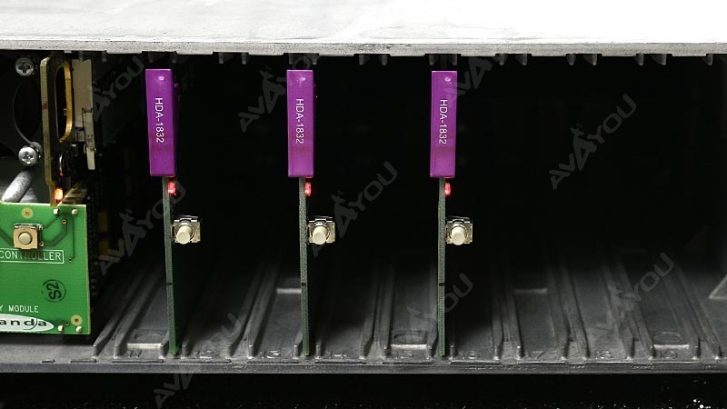 The HDA-1832 is a high definition serial digital video distribution amplifier. The HDA-1832 has one input, and 9 outputs, with automatic equalization for up to 110 meters of cable (Belden 1694a) at 1.48 Gbps. The amplifier offers signal presence detection and remote reporting. While primarily designed for distribution of HD serial digital signals (SMPTE 292M), the HDA-1832 provides convenient support for SD serial digital signals (SMPTE 259M) as well. This multirate feature makes the HDA-1832 ideal for applications where HD and SD signals may coexist. The HDA-1832 is designed for use in the DENSITÉ frame.