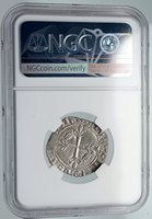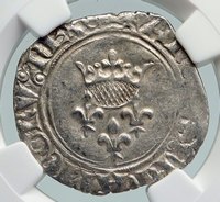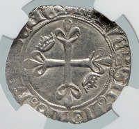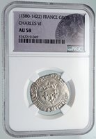 France under Charles VI - King: 16 September 1380 - 21 October 1422 Silver Gros 26mm (3.059 grams), Struck between 1380-1422 AD Reference: Dy# 387 Certification: NGC AU 58 5747219-049 + KAROLVS: FRANCORV: REX, Crown, three fleur-de-lis below. + SIT: NOME: DNI: BENEDICTV, Cross with fleur-de-lis on each arm. You are bidding on the exact item pictured, provided with a Certificate of Authenticity and Lifetime Guarantee of Authenticity.