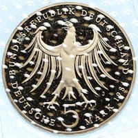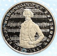 Germany 175th birthday of Felix Mendelssohn Bartholdy 1984 J Copper-Nickel clad Nickel 5 Marks 29mm (10.20 grams) Reference: KM# 161 | Engraver: Carl Vezerfi-Clemm BUNDESREPUBLIK DEUTSCHLAND 5 DEUTSCHE MARK 1984 J, An eagle, emblem of the German Federal Republic Hambourg mint mark (J). FELIX MENDELSSOHN BARTOLDY 1809-1847, Jacob Ludwig Felix Mendelssohn Bartholdy with a watermark of his piece "A Midsummer Night's Dream" opening musical notes. Edge Lettering: IHR TÖNE SCHWINGT EUCH FREUDIG DURCH DIE SAITEN