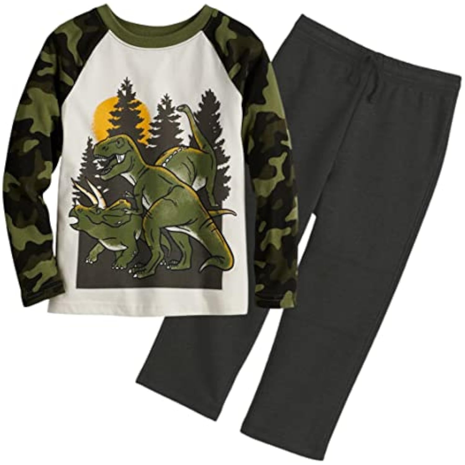 Toddler Boy Jumping Beans Dinosaurs Camo Raglan Tee & Fleece Pant - Set 12M. Double stitching on neck, sleeves, hem, waistband and ankles for added durability. Fabric: Tee - 100% Cotton. Pant - 53% Cotton 47% Polyester. Imported. Size: 12M. Colors: Tee Olive Green, shades of black and cream. Pant - black. Machine wash.