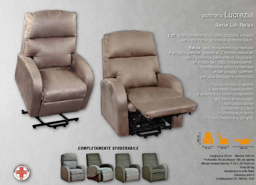 Le nostre poltrone sono detraibili fiscalmente in quanto Dispositivo Medico di classe I. Sono inoltre garantite per 2 anni e certificate CE, TUv e ROHS.