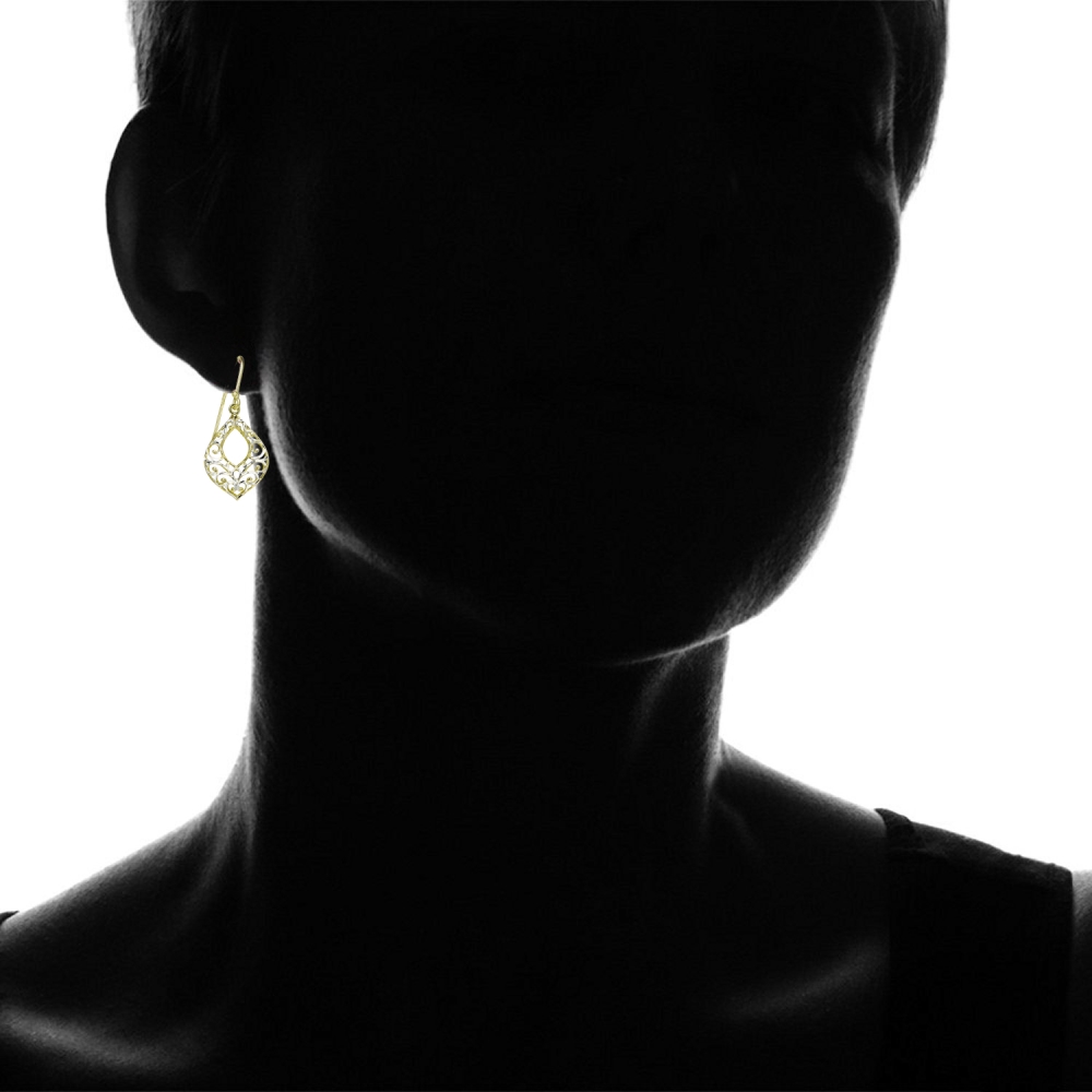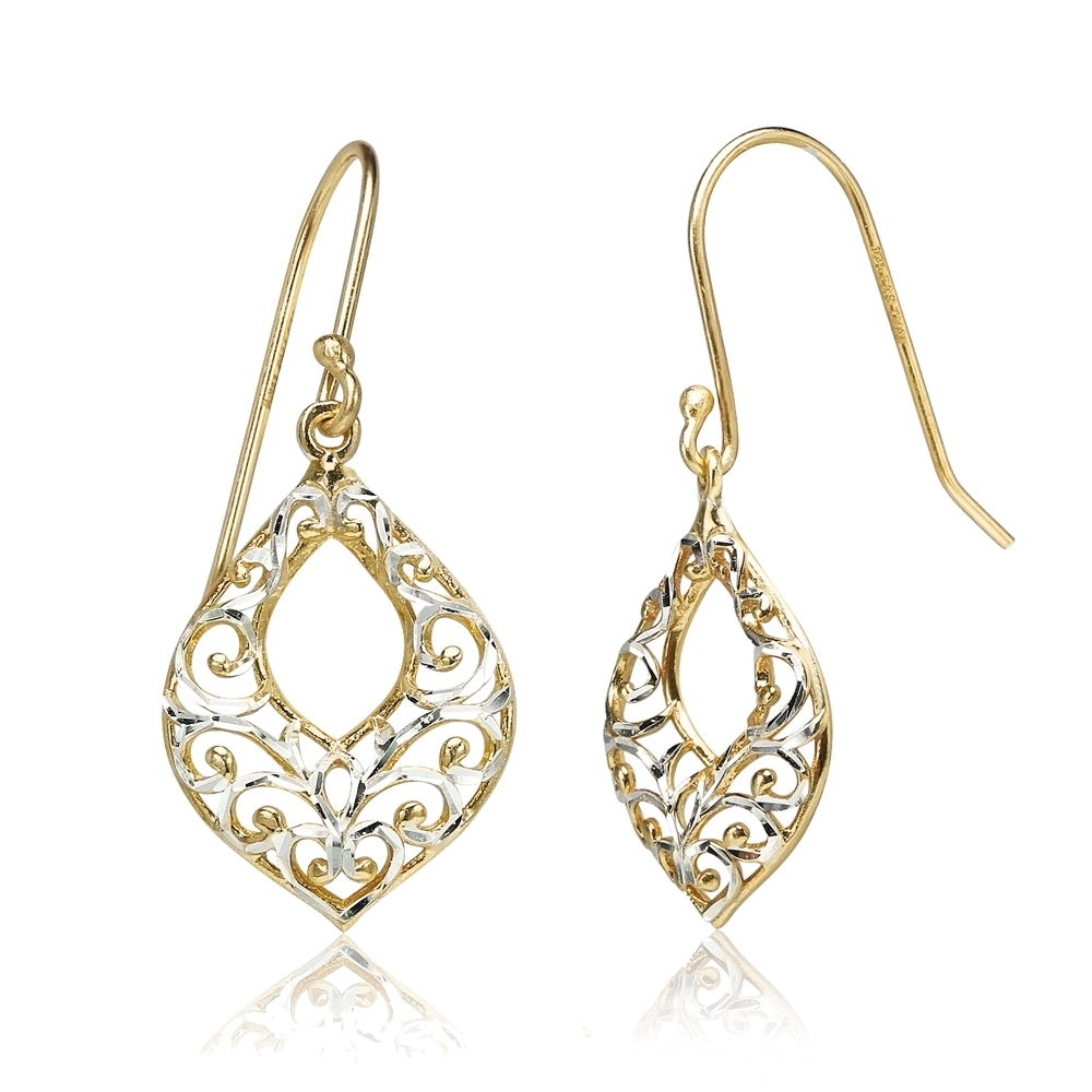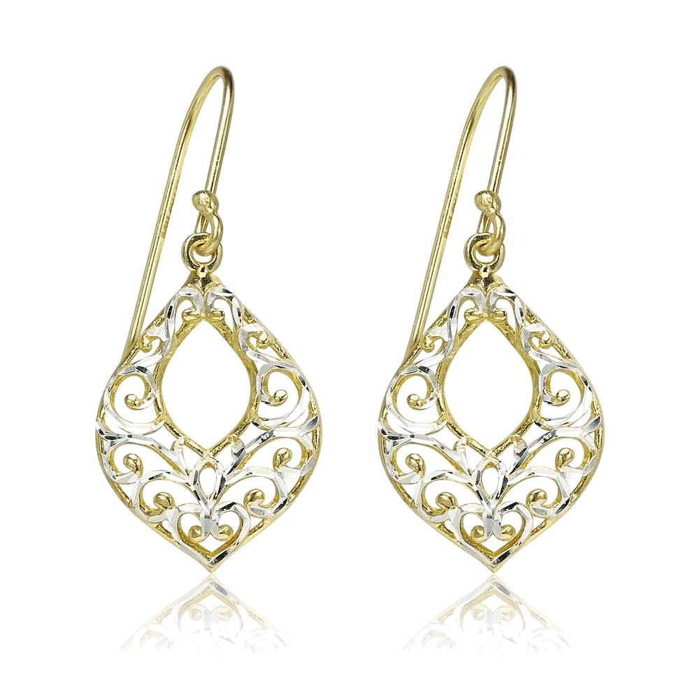 | These trendy dangle earrings showcase a polished open teardrop filigree design for a chic and fashionable look. These earrings are made of two-tone yellow gold flashed .925 sterling silver and secure by fishhooks. These earrings can be purchased as dangle earrings for women and dangle earrings for teen girls. ET16069 |