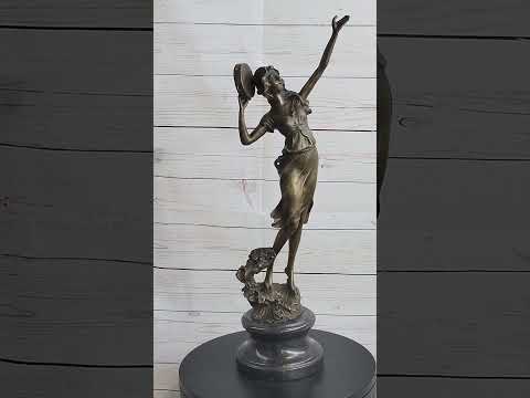 In this captivating sculpture, a young woman stands amidst blossomed flowers, her gaze directed skyward as she taps her tambourine to her head. With her long hair and flowing dress gently swaying in the soft breeze, she exudes an ethereal and timeless beauty, seemingly calling to the winds above.