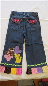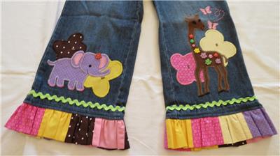 These capris are so cute! Gymboree denim capris were custom appliqued to match the Glamour Safari line. Colorful ruffles were added to the cuffs. Capris have the hidden adjustable waistband. The capris were washed on gentle cycle and hung to dry prior to customizing. They were never worn. This listing is for the capris only. Matching items are available for purchase separately. Tons of girls, baby, toddler and custom clothing listed and everything always ships for free!