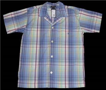 Ralph Lauren Tartan Plaid S/S Pajama Top / Shirt. Soft tones. Embroidered navy blue pony logo on left chest pocket, blue piping. All cotton. MSRP $44. Men's size Medium. This appears to run large - see chest measurement below.