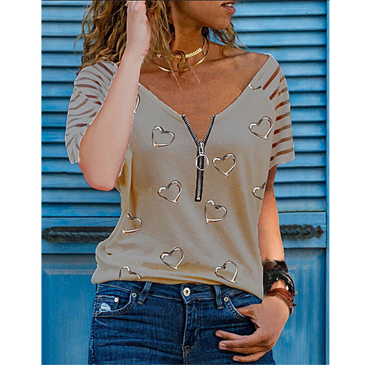 Womens Ladies V Neck Short Sleeve Casual Blouse Basic T-Shirt Zipper Tops