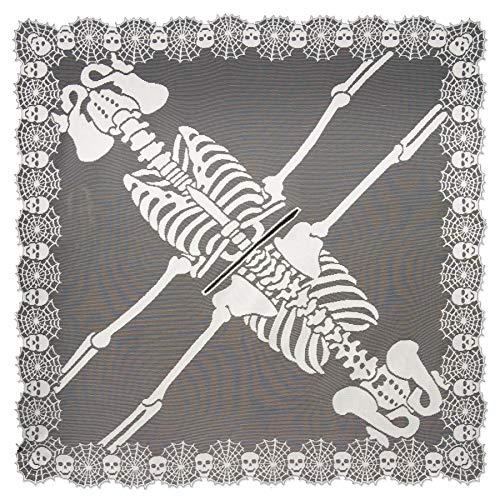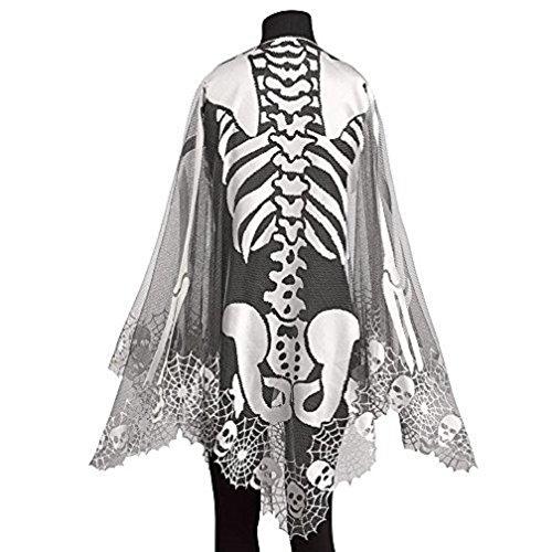 Heritage Lace Skeleton 60"X60" Pewter Poncho. Get ready for a spooky night with this Skeleton poncho. Whether you're off to a party or staying home to hand out candy, the Skeleton poncho is sure to showcase your Halloween spirit. Poncho features life-size skeleton design accented by cobweb and skull boarder. You'll be sure to scare up scores of compliments with this shimmery pewter and black accessory. Ponchos, scarves, shawls, tanks or wraps, lacy and casual. The final touch that pulls it all together with panache. A rich harvest. Halloween fun. Great reasons to celebrate. Poncho measures 60" x 60". One size fits all. Fine-gauge lace. 100-Percent polyester. Machine wash cold, gentle. Do not bleach. Lay flat or hang to dry. Touch up with cool iron if desired.