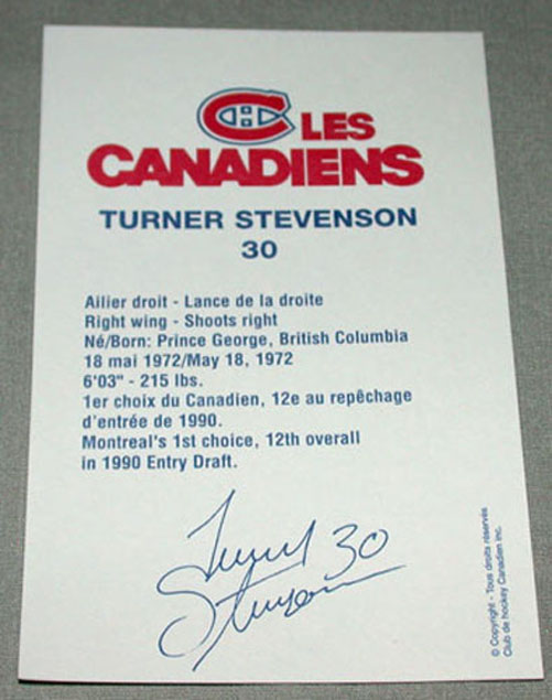 Original NHL Turner Stevenson Montreal Canadiens Signed Hockey Postcard . He has signed the front with a blue felt pen and the signature is very clean and clear. It measures 5.5 inches by 3.5 inches. This signed postcard is guaranteed to be genuine and original and will come with a letter of authenticity. Condition is excellent with hardly any sign of handling. Feel free to email me if you have any questions.