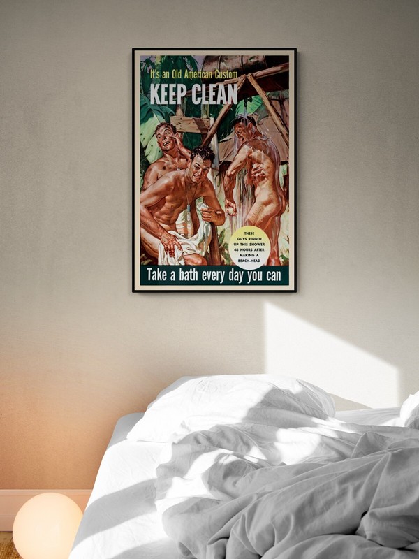 This great Vintage Style World War 2 Poster shows American soldiers taking a shower in a pacific island jungle setting.