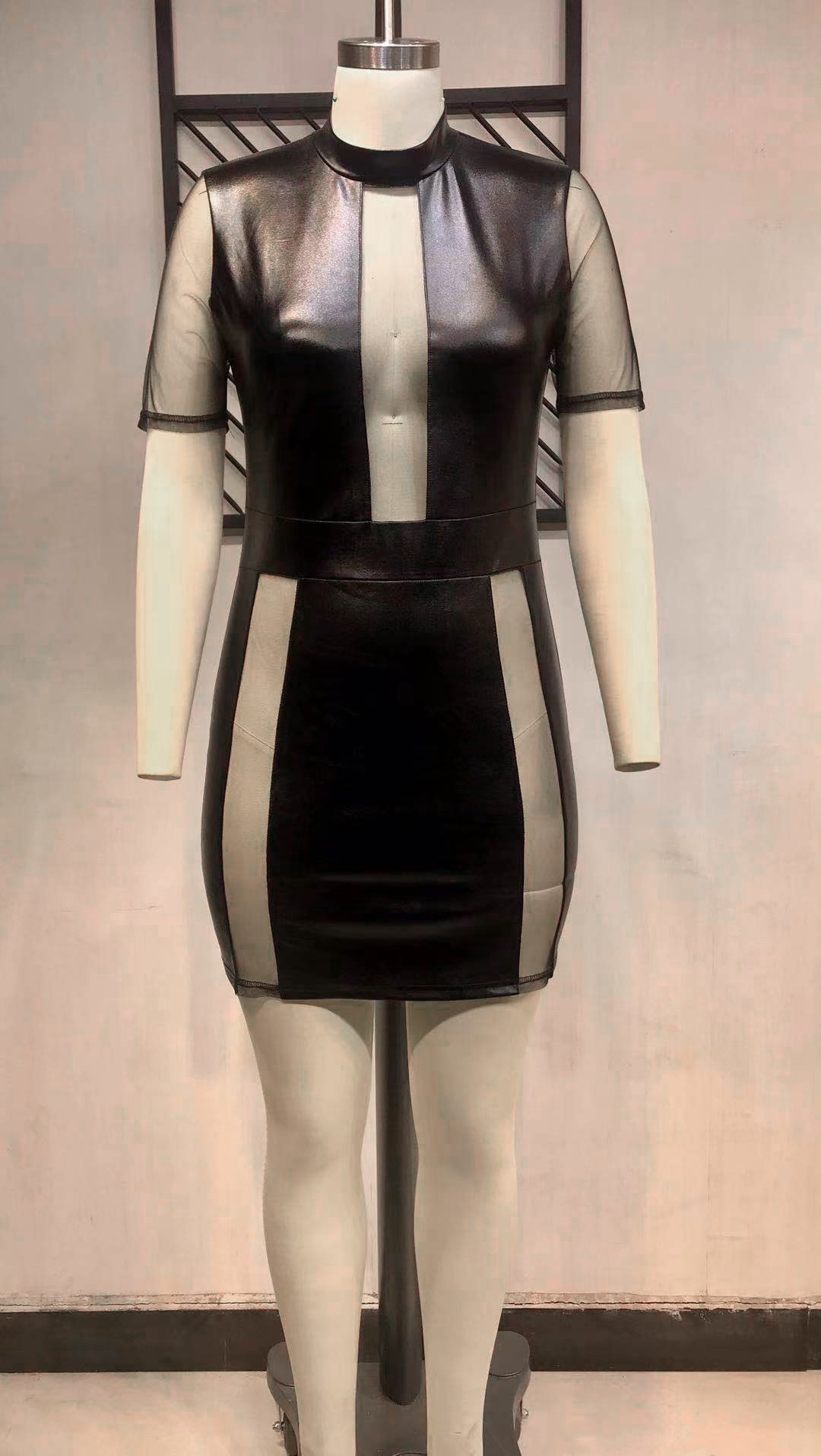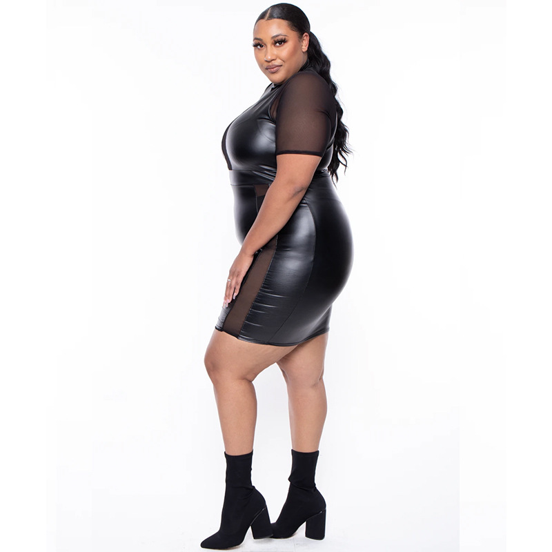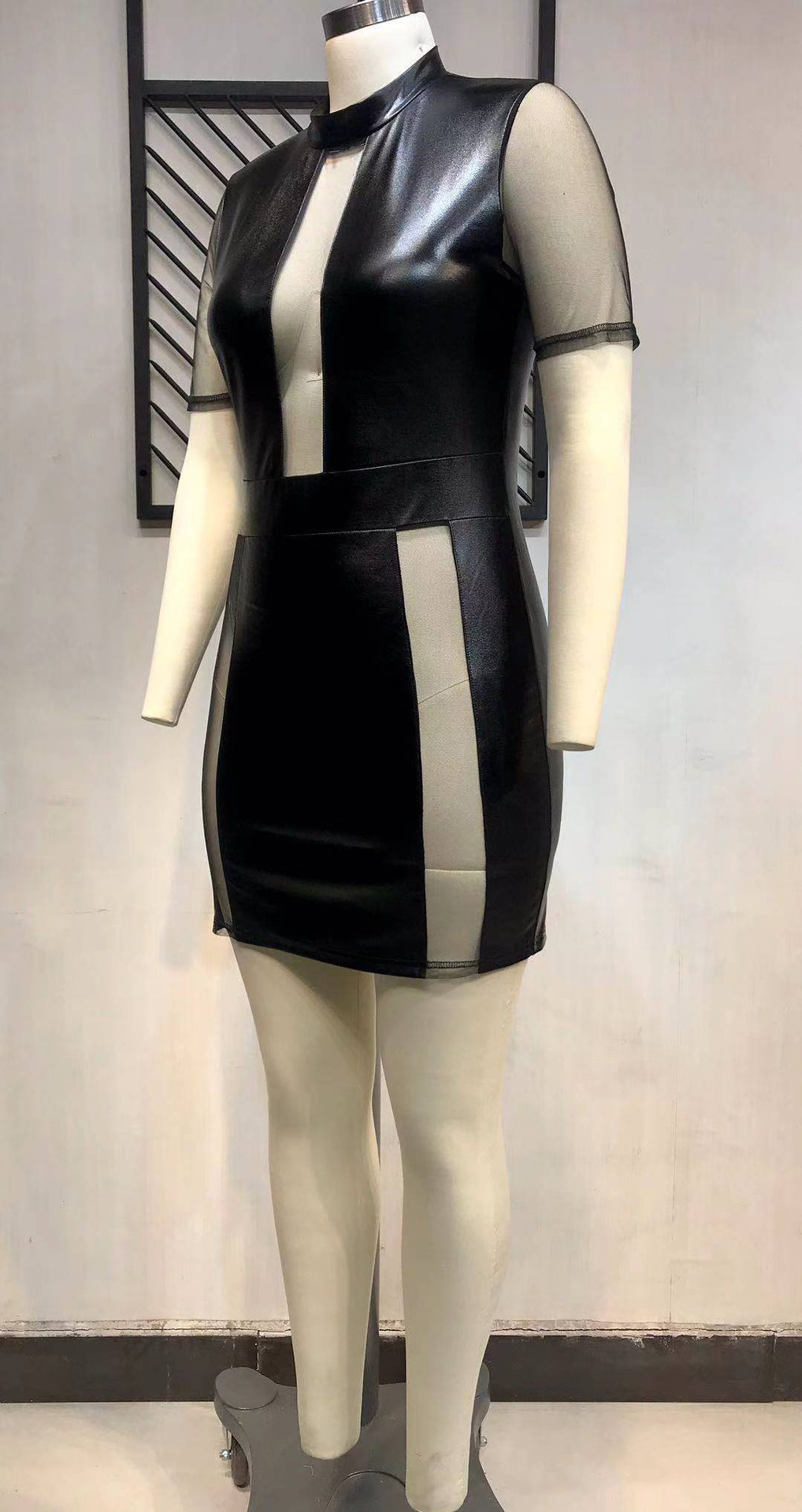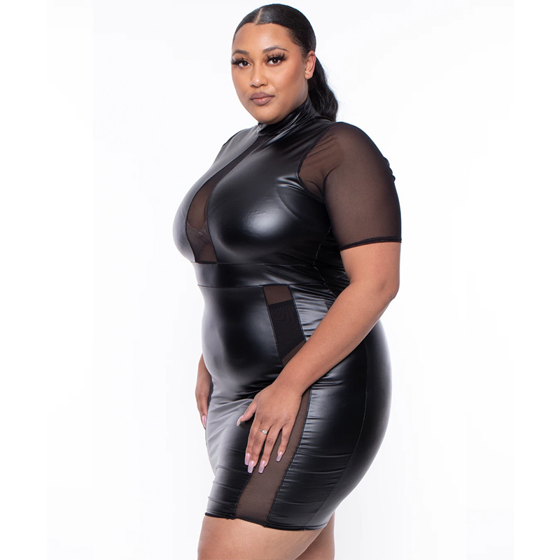 New Plus Size Women Short Sleeve Mesh Patchwork Casual Club Bodycon PU Dress