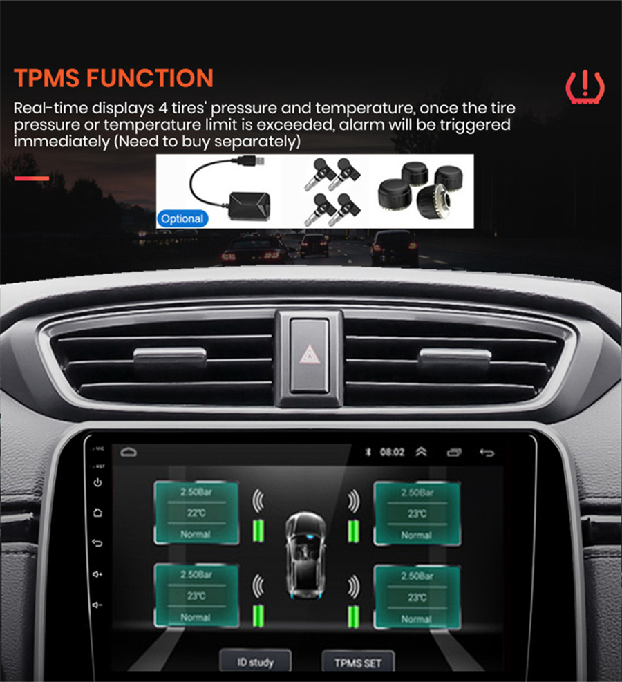 Additional | - Textbook: Could change font, font color, background color, bookmark, reading E-book while listening music - Photo Viewer: Support JPS, BMP, PNG, GIF etc. format. play by revolve, Powerpoint Support 4096*4096 Pixels - Wallpapers: 5 live wallpapers, 17 standard wallpapers, support DIY wallpaper from Gallery - APK Installer: Support Android Package installer - Support Torque Pro(OBD2 &Car): Yes, you can connect a Bluetooth OBD2 Scanner Tool to use this function - Support Mirror Link function: Yes, support screen mirroring from iPhone and android smartphone - Support TPMS: YES (Not Included) |