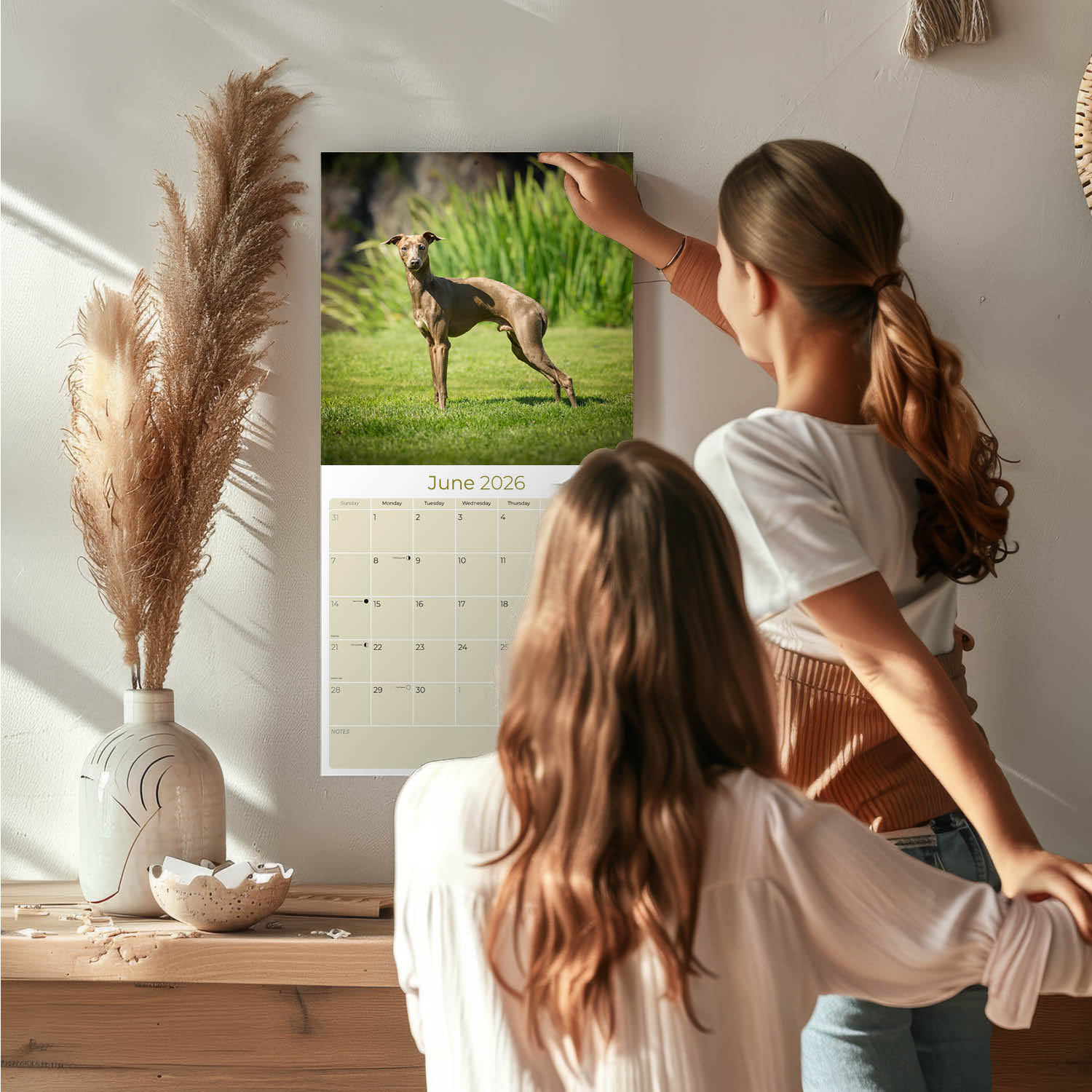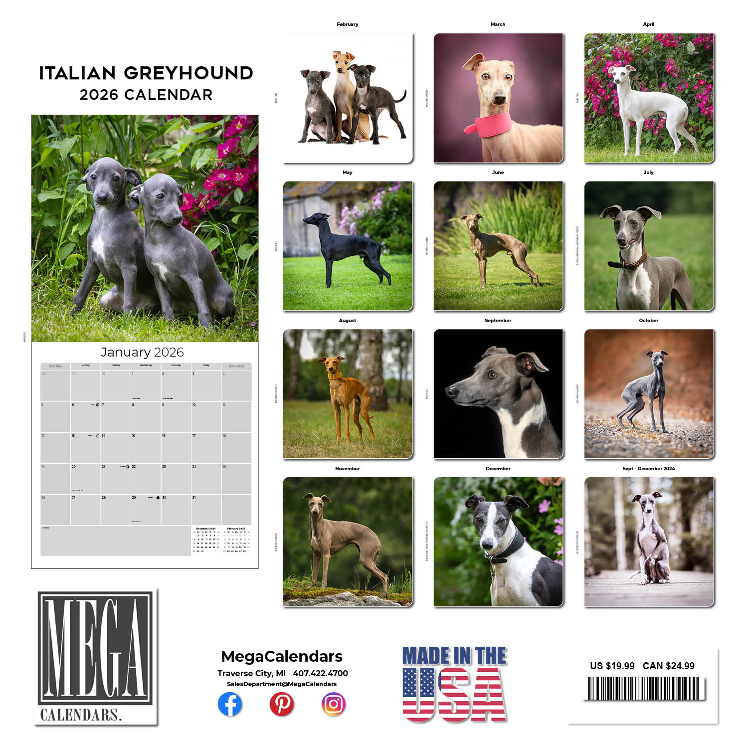 - BONUS SEPT - Dec 25 INCLUDED - Hanging monthly wall calendar from SEPTEMBER 2025 - DEC 2026. A square calendar of beautiful Italian Greyhounds is ideal for creating a comfortable look in home & office. Size Closed: 12 W x 24 H, Size Opened: 12 W x 24 H.