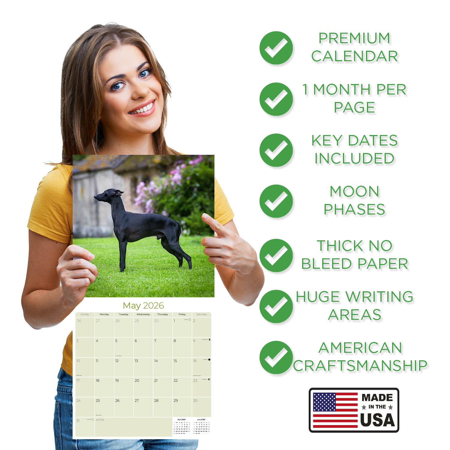 - PREMIUM PAPER - Each of our small batch Italian Greyhound calendars runs uses the thickest paper in their class. Our artisans produce these premium BONUS month 2026 Italian Greyhound calendars with high-definition Italian Greyhound images and print them right here in the U.S.A. using the highest quality inks and environmentally friendly American paper from responsible sources.