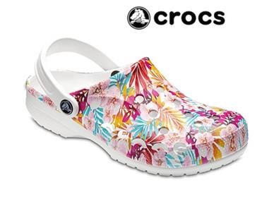 Crocband CLASSIC GRAPHIC TROPICAL LEAVES Mule Baya Crocs. Bright colors of cerulean, chartreuse, royal blue, green, etc. Pivot strap can be worn up or behind heel. Small embossed dots on interior footbed. Holes on top. Deep tread. Men's 11, EU 45-46. Roomy and wide (wider than average). SOLD OUT.