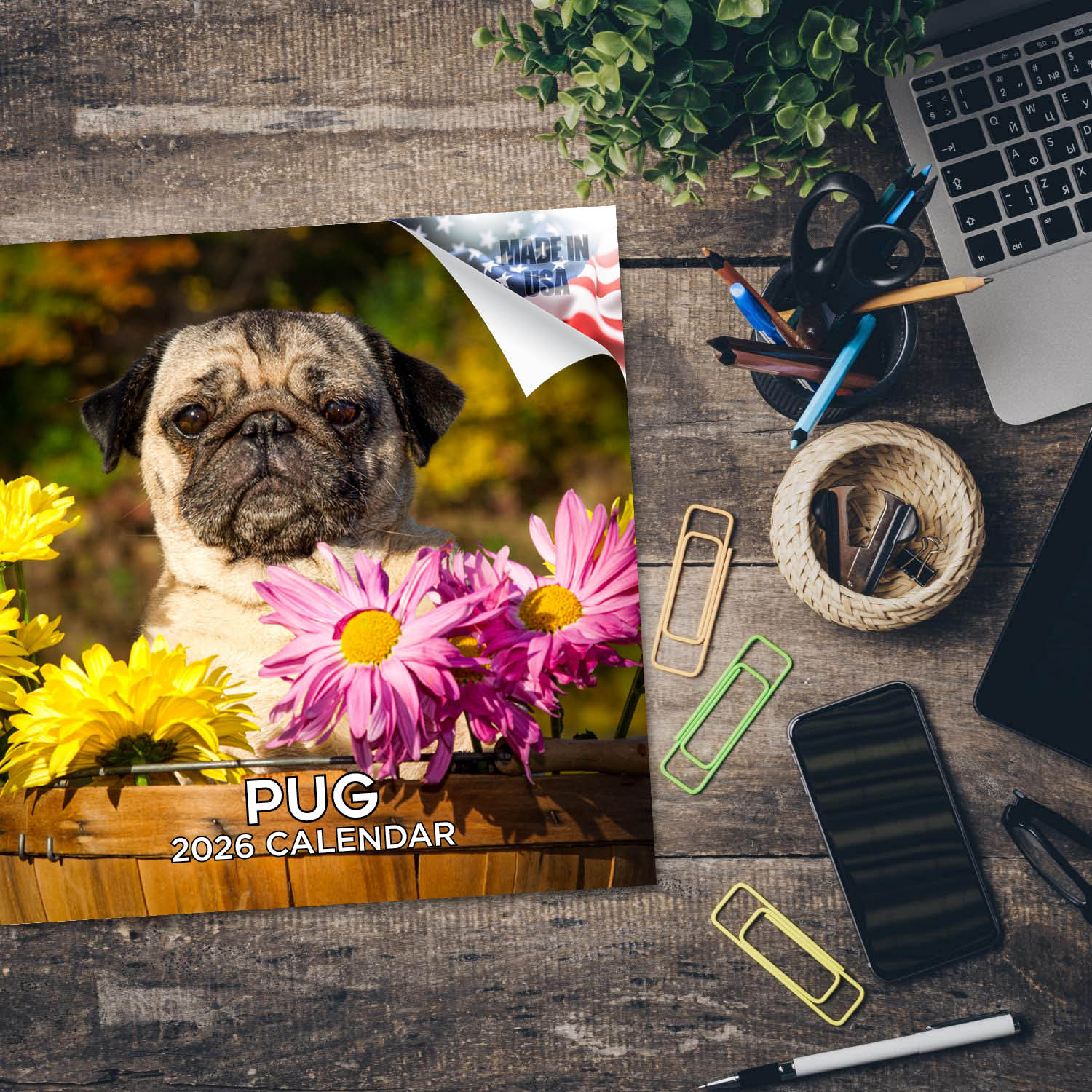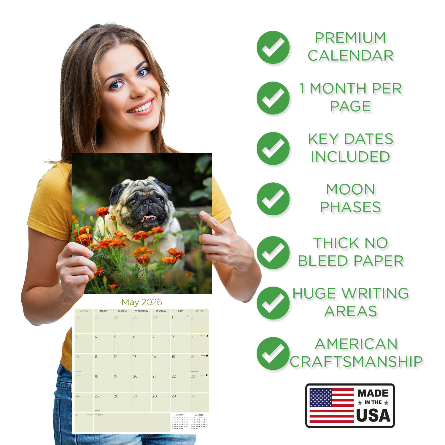 - PREMIUM PAPER - Each of our small batch Pug calendars runs uses the thickest paper in their class. Our artisans produce these premium BONUS month 2026 Pug calendars with high-definition Pug images and print them right here in the U.S.A. using the highest quality inks and environmentally friendly American paper from responsible sources.