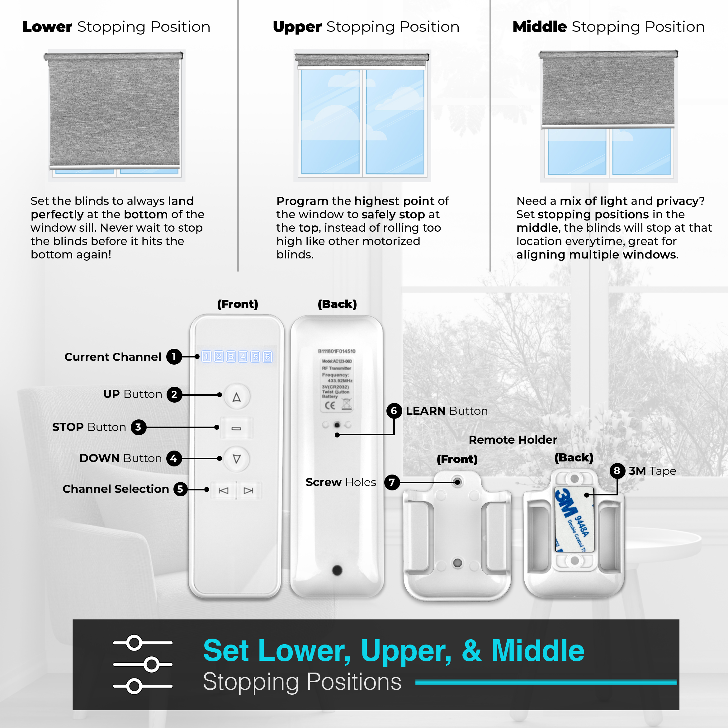 - [ EASY CONTROL ] Our Motorized Shades have a Modern Cordless Design that Combines Elegance with Functionality! Precise Remote Control Lets You Freely Raise, Lower, and Stop the Blinds at the Exact Position You Want. The 6-Channel Remote Allows You to Connect Up to 6 Separate Smart Blinds. You Can Either Control Each Blind Individually or You Can Control All 6 At Once! Save Precious Time by Controlling the Blinds From Anywhere in Your House Even While Working, Cooking, Exercising, Cleaning and Other Activities!