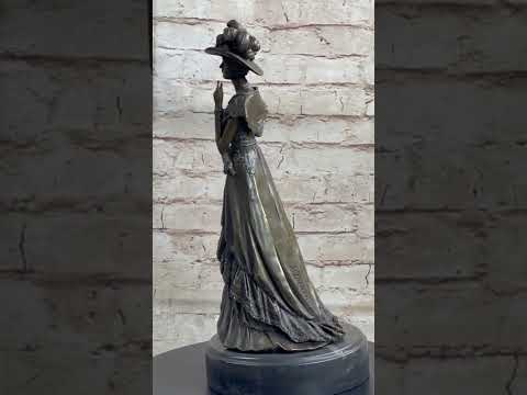 The subtle tilt of her head and the serene smile on her face convey a sense of tranquility and benevolence, further enhanced by the intricate craftsmanship evident in every detail of her flowing, elegant dress. Meticulously created using the renowned lost-wax method of casting, the sculpture bears the hallmark of the artist's skill and artistry. Its lustrous brown patina finish adds depth and character, while the sculpture is securely mounted on a sturdy black marble plinth.
