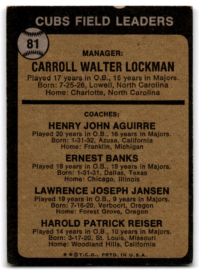 | Description: | Whitey Lockman/Hank Aguirre/Ernie Banks/Larry Jansen/Pete Reiser | | Category: | Baseball | | Year: | 1973 | | Product: | Topps | | Team: | Chicago Cubs | | Card Number: | 81 | | Dimensions: | 3½" x 2½" |