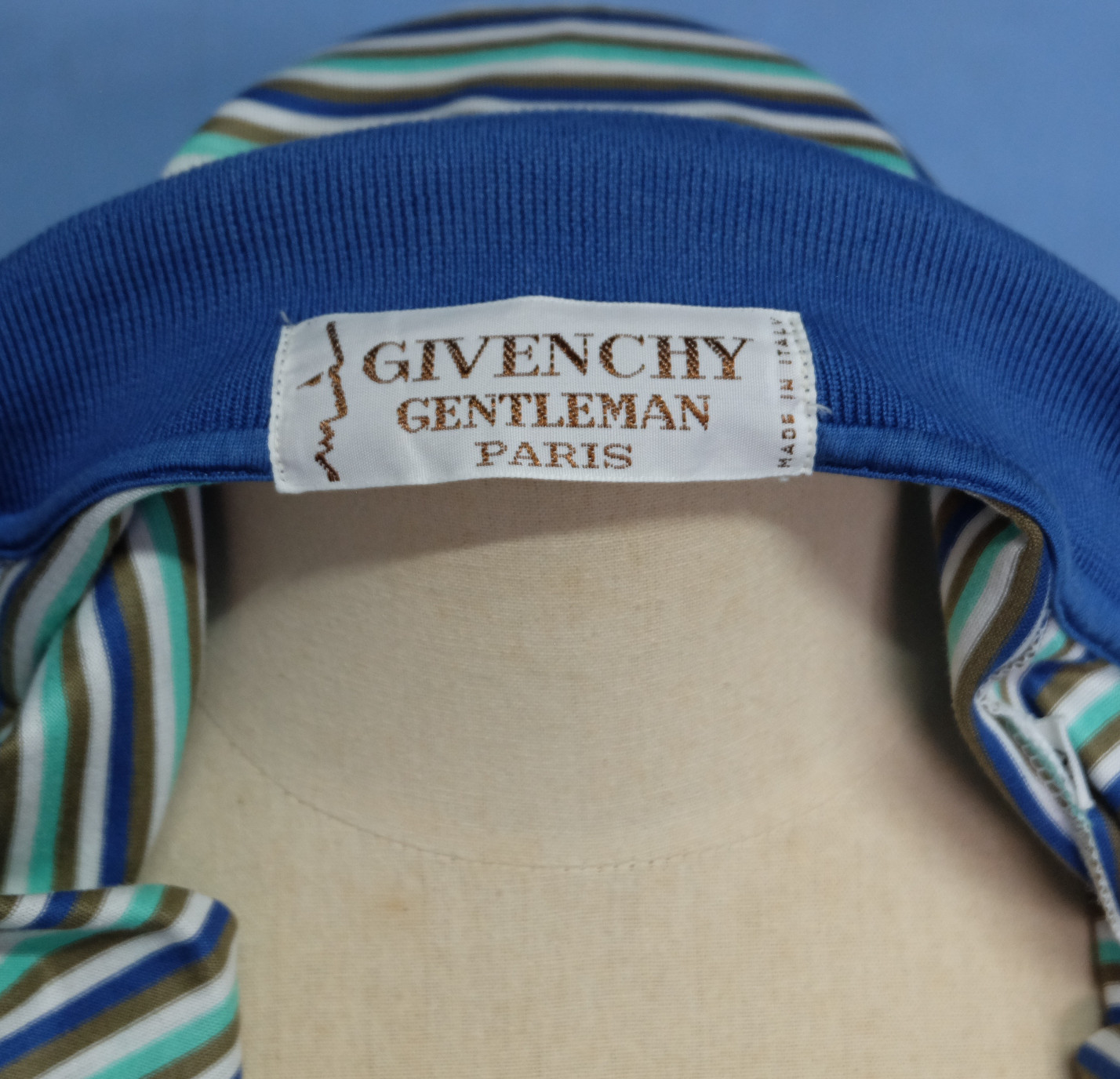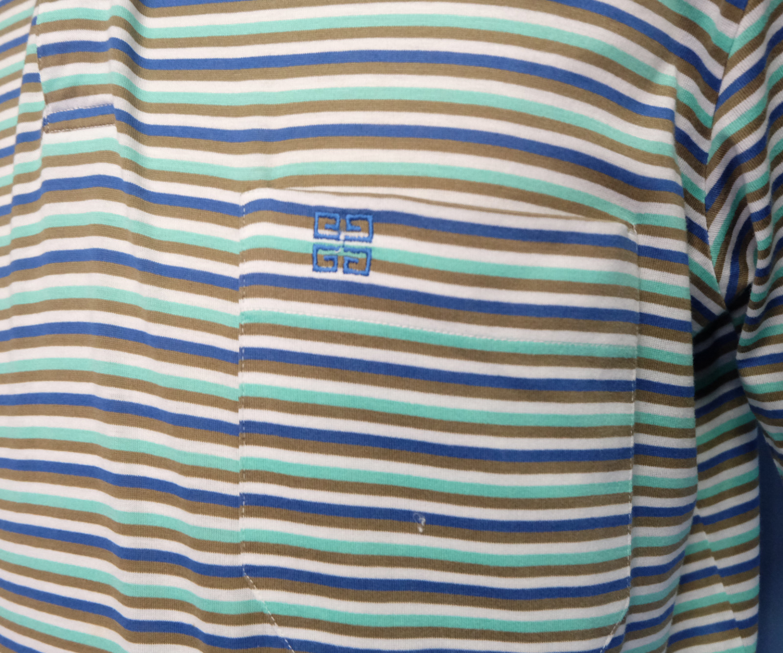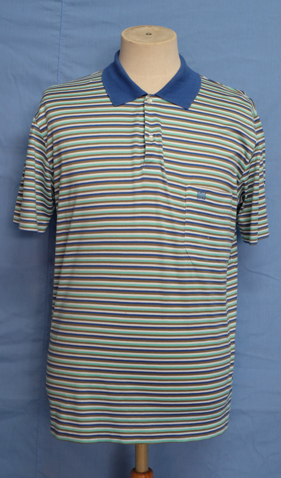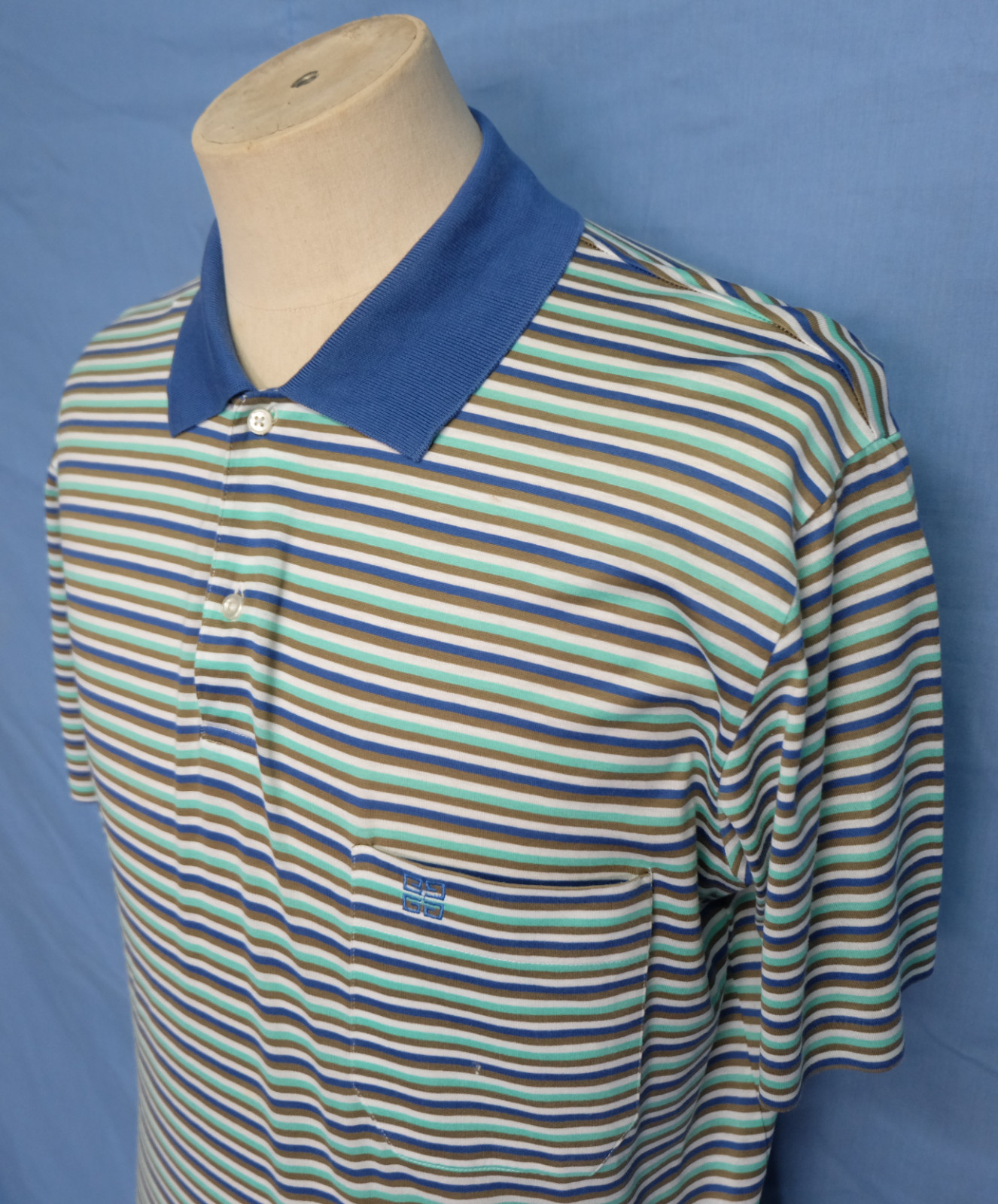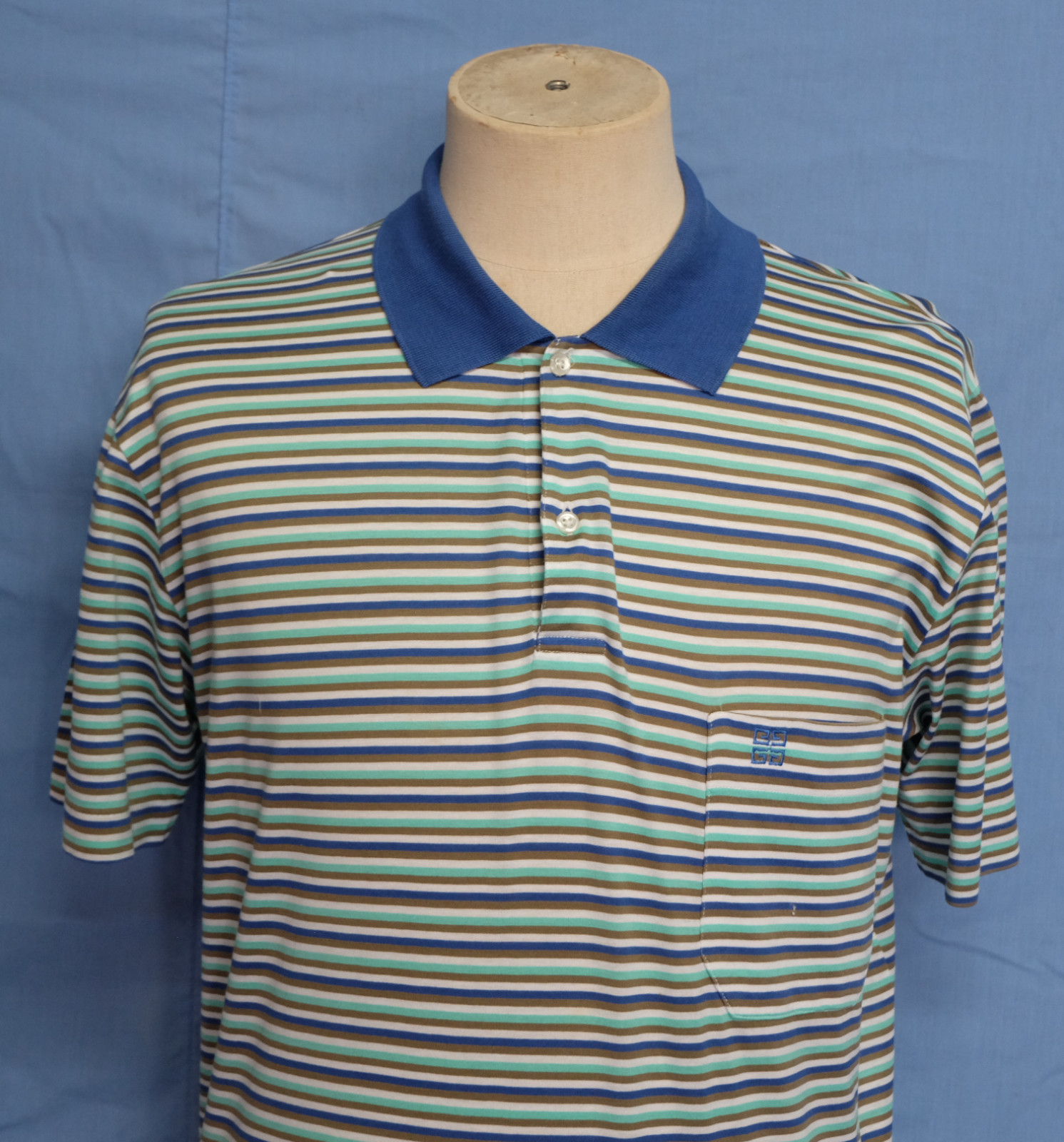 Cool vintage 90's GIVENCHY Gentleman multicolor striped men's polo shirt short sleeves with buttons front authenticity guaranteed. The shirt is pre-owned still in excellent condition, there are no holes, tears, stains. It has been laundered clean and fresh ready to wear. The shirt has polo collar, 3 mother buttons closure on front. The shirt pocket is embroidered with the brand's logo. The color is blue, white, mint, dark beige with striped pattern. Fabric is 100% cotton. Don't miss out cool and awesome shirt.