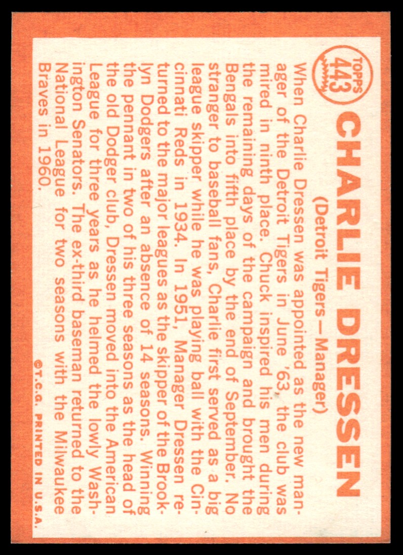 | Description: | Chuck Dressen | | Category: | Baseball | | Year: | 1964 | | Product: | Topps | | Team: | Detroit Tigers | | Card Number: | 443 | | Dimensions: | 3½" x 2½" |