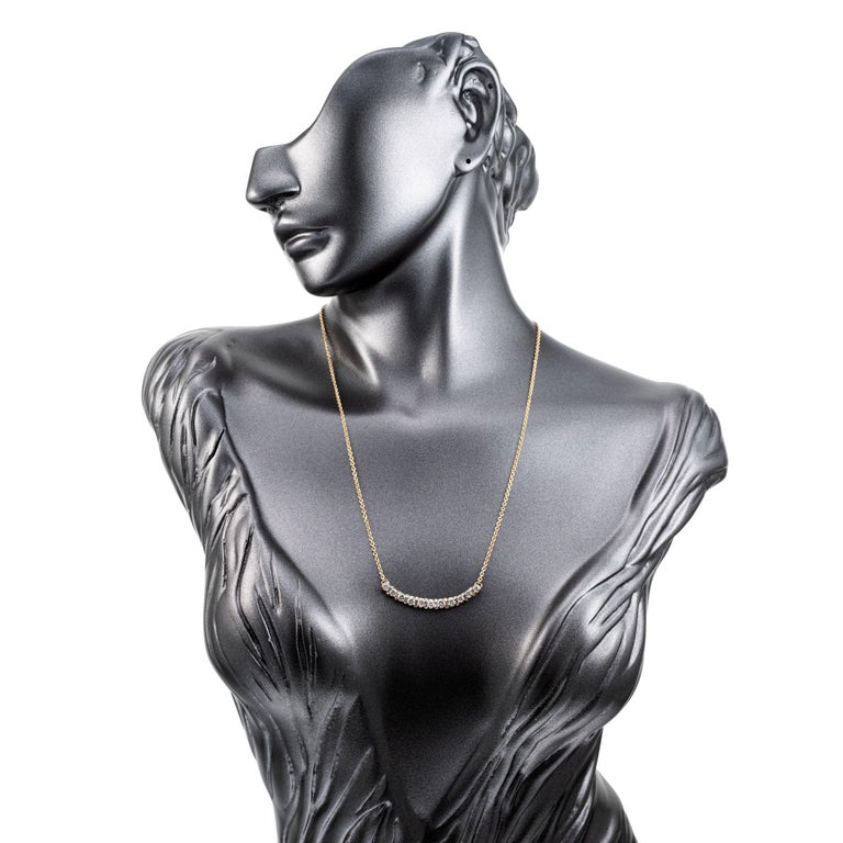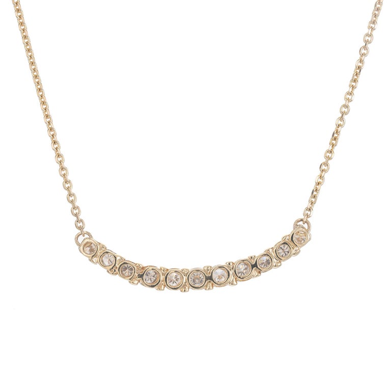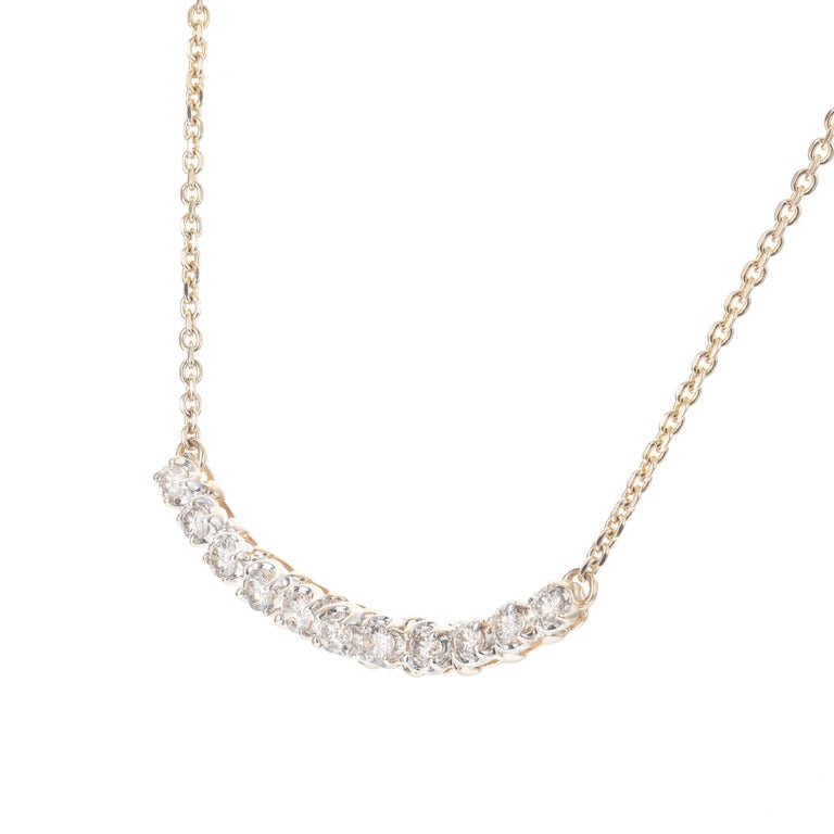 Diamond pendant necklace. 11 graduated diamonds in a curved 14k yellow and white gold bar with a 19-20 Inch chain. Designed and crafted in the Peter Suchy workshop
