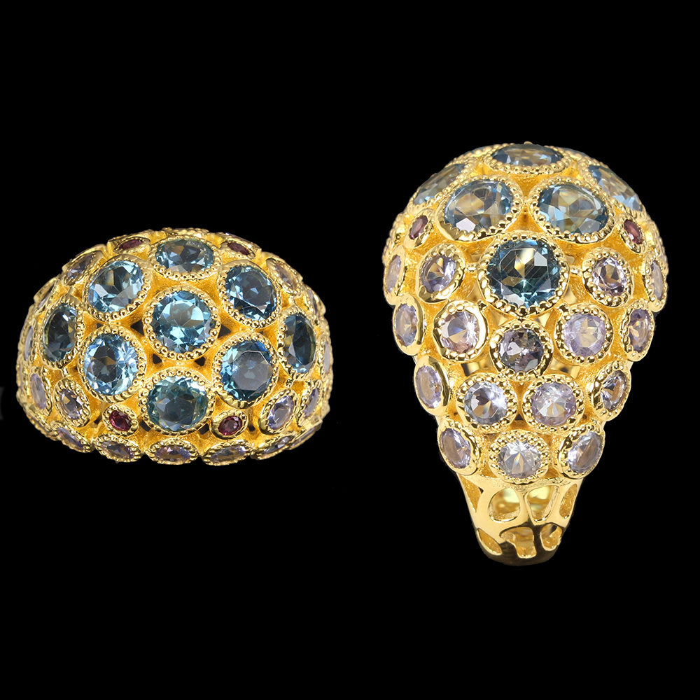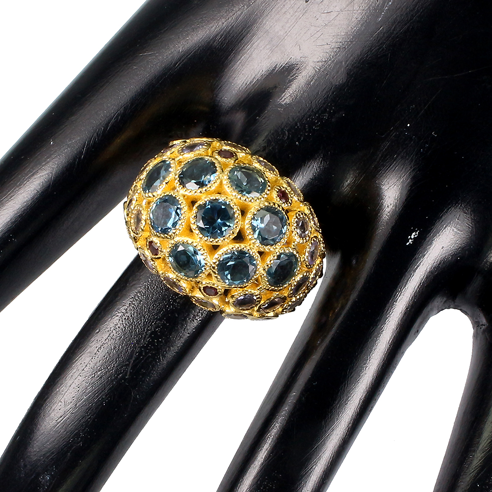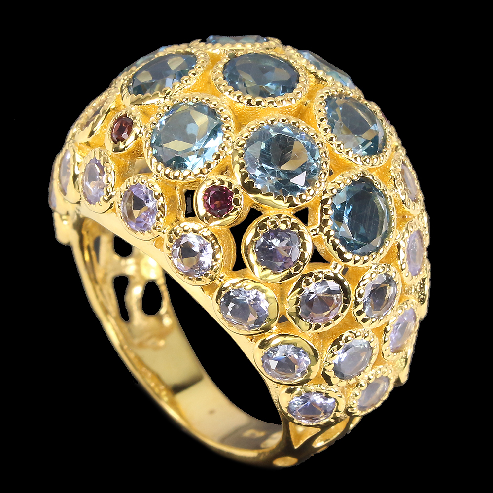 Round Swiss Blue Topaz Rhodolite Garnet Tanzanite 925 Sterling Silver Ring Sz 7