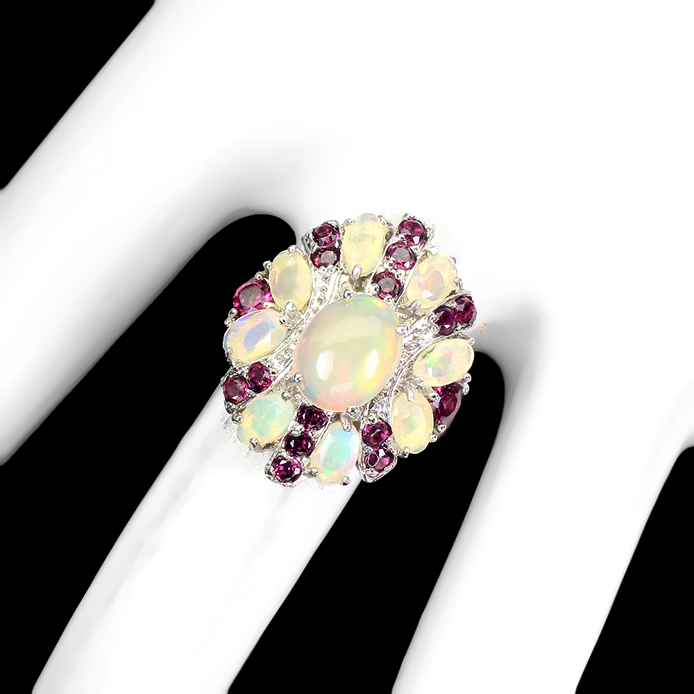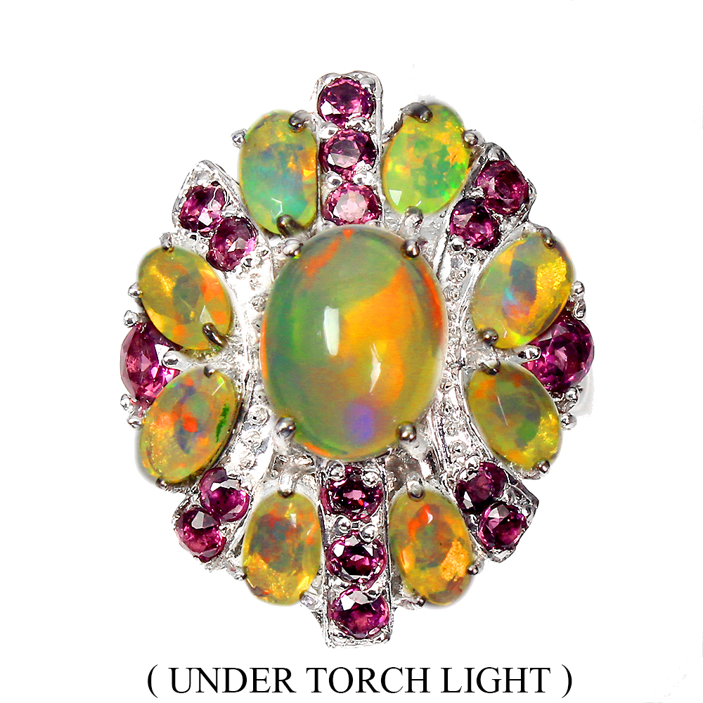 Unheated Oval Fire Opal Rainbow 9x7mm Rhodolite Garnet 925 Sterling Silver Ring