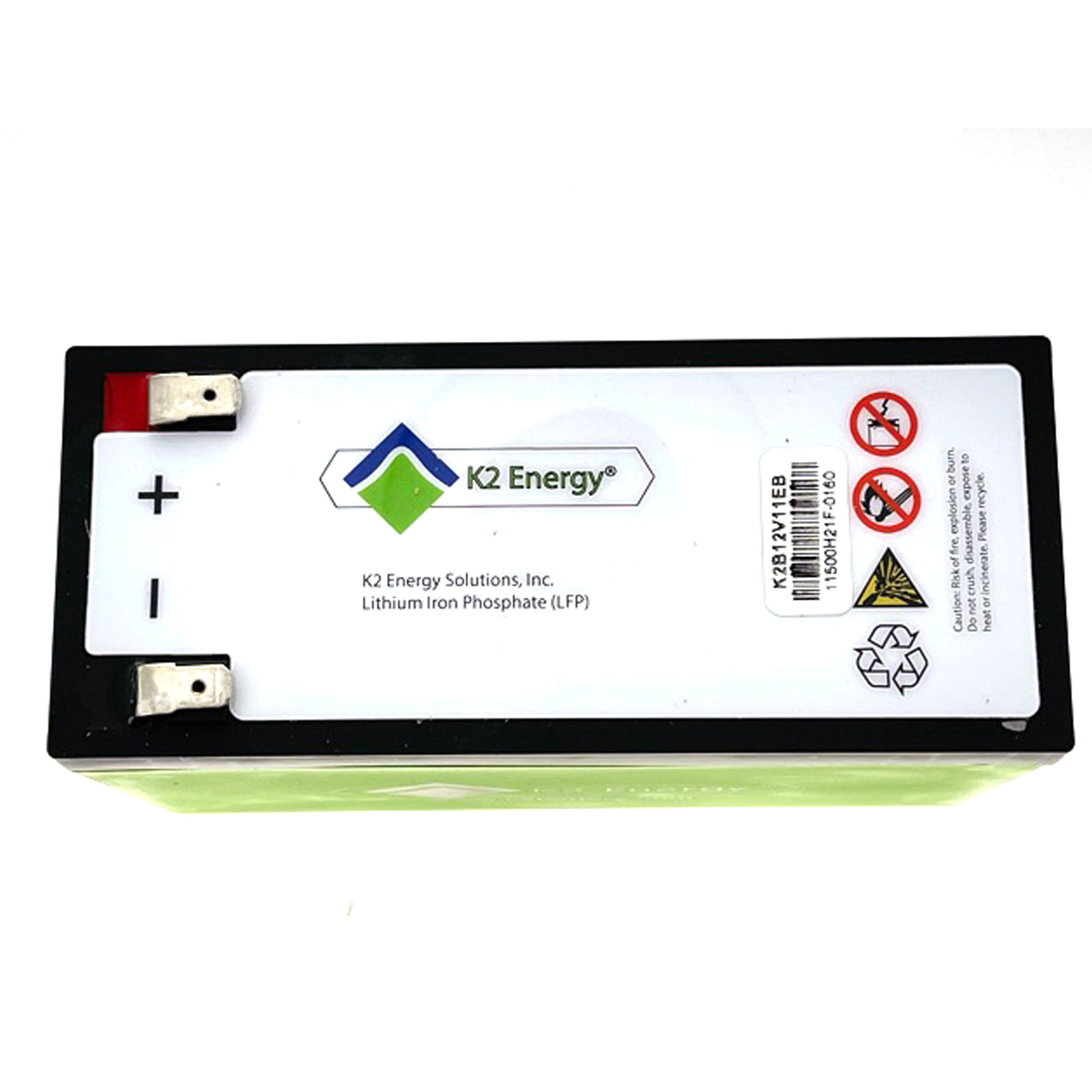 K2 Energy 12V 11Ah K2B12V11EB Lithium Iron Phosphate Battery is the ultimate in weight versus power technology. This is a drop in Compatible With for your Lead-acid battery, and will require no change to your stock charging system. It can be placed in electric scooters, bikes, UPS backup systems and wheelchairs anything that uses a sealed lead acid battery. LifePO4 contains no poisonous lead, no acid, and do not create gasses during charge, as traditional Lead-Acid batteries do. Compared to lead-acid, Lithium Iron Phosphate batteries are also extremely light, have much lower self-discharge, do not sulfate, and are environmentally friendly. Because of its light weight, safety, excellent thermal stability, good electrochemical properties and high specific capacity is this application of the material very well received.