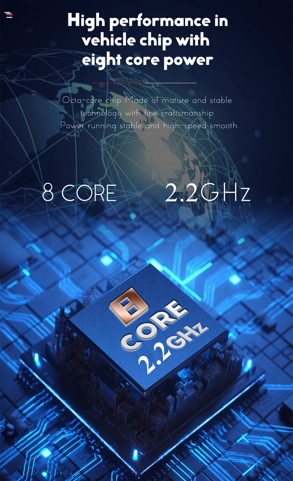 System | - Operation System: Android 10 - CPU: Octa-Core 2.2GHz - ROM: 32GB - RAM: 2GB- Extended USB: Support USB Disk up to 32GB |