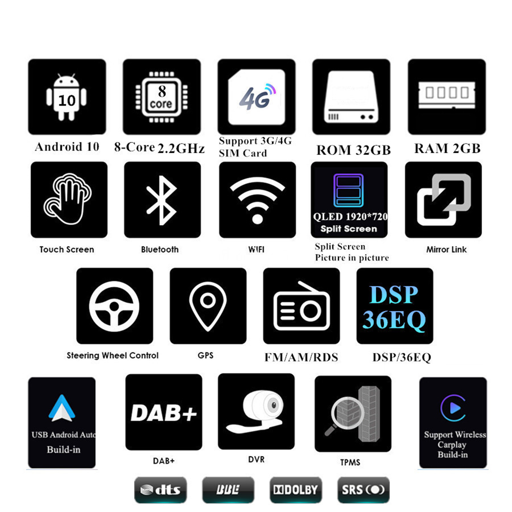 Additional | - Textbook: Could change font, font color, background color, bookmark, reading E-book while listening music - Photo Viewer: Support JPS, BMP, PNG, GIF etc. format. play by revolve, Powerpoint Support 4096*4096 Pixels - Wallpapers: 5 live wallpapers, 17 standard wallpapers, support DIY wallpaper from Gallery - APK Installer: Support Android Package installer - Support Torque Pro(OBD2 &Car): Yes, you can connect a Bluetooth/WIFI OBD2 Scanner Tool(Bluetooth version ≥ 4.2) to use this function - Support Mirror Link function: Yes, support WIFI/USB screen mirroring from iPhone and android smartphone - Support TPMS: YES (Not Included) -Support Steering Wheel Control;Yes |