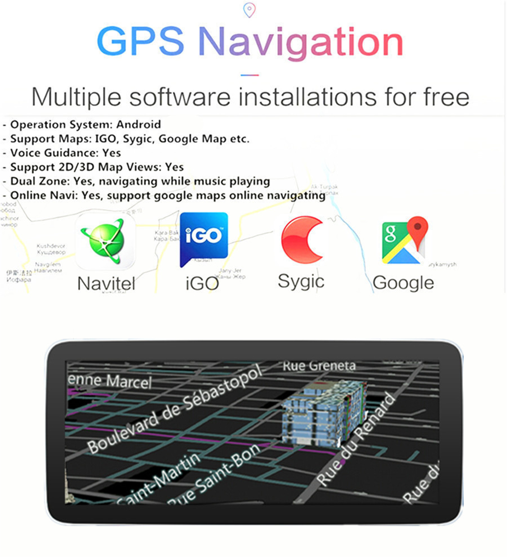 GPS | - Operation System: Android 10 - Support Maps: IGO, Sygic, Google Map etc. - Voice Guidance: Yes - Support 2D/3D Map Views: Yes - Dual Zone: Yes, navigating while music playing - Online Navi: Yes, support google maps online navigating |