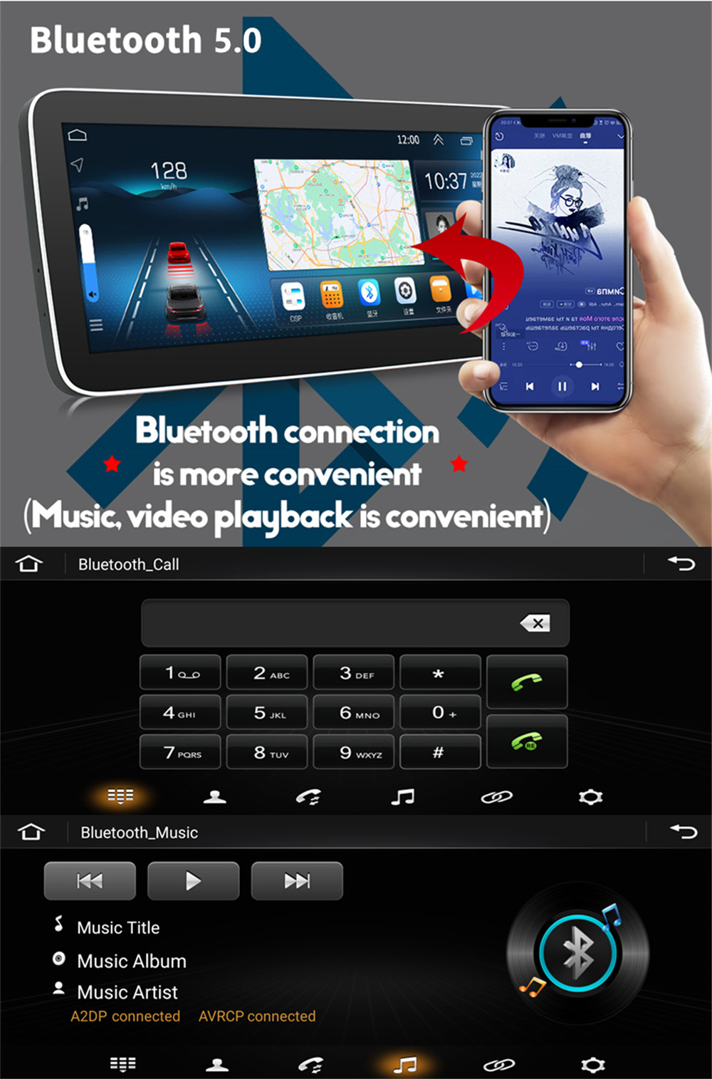Bluetooth | -Bluetooth 5.0 - Hands Free: Yes - A2DP (Bluetooth Stereo Music): Yes, can play stereo music through Bluetooth- Bluetooth Music Control: Yes, play/pause/previous/next - PB-Download: Yes, can download phonebook from mobile to this unit - PB-Search: Yes, can use the first letter to search contact member in PB-Listings - Calling Records: Yes, Dialed Call, Received Call, Missed Call - Setup: Auto Answer, Auto connect, Device name - Built-in Microphone: Yes, on the front panel - External Microphone Jack:Yes on the RCA cable |