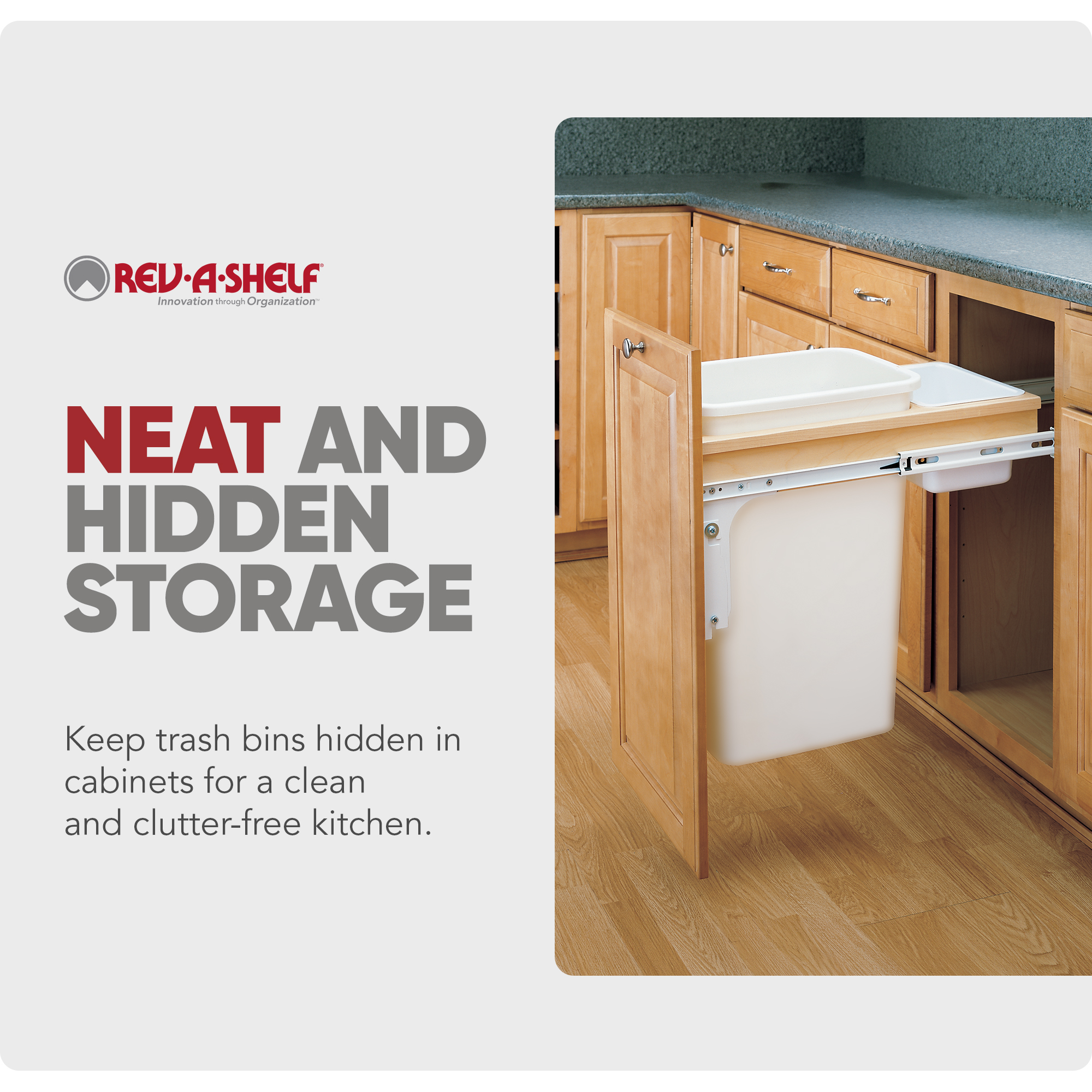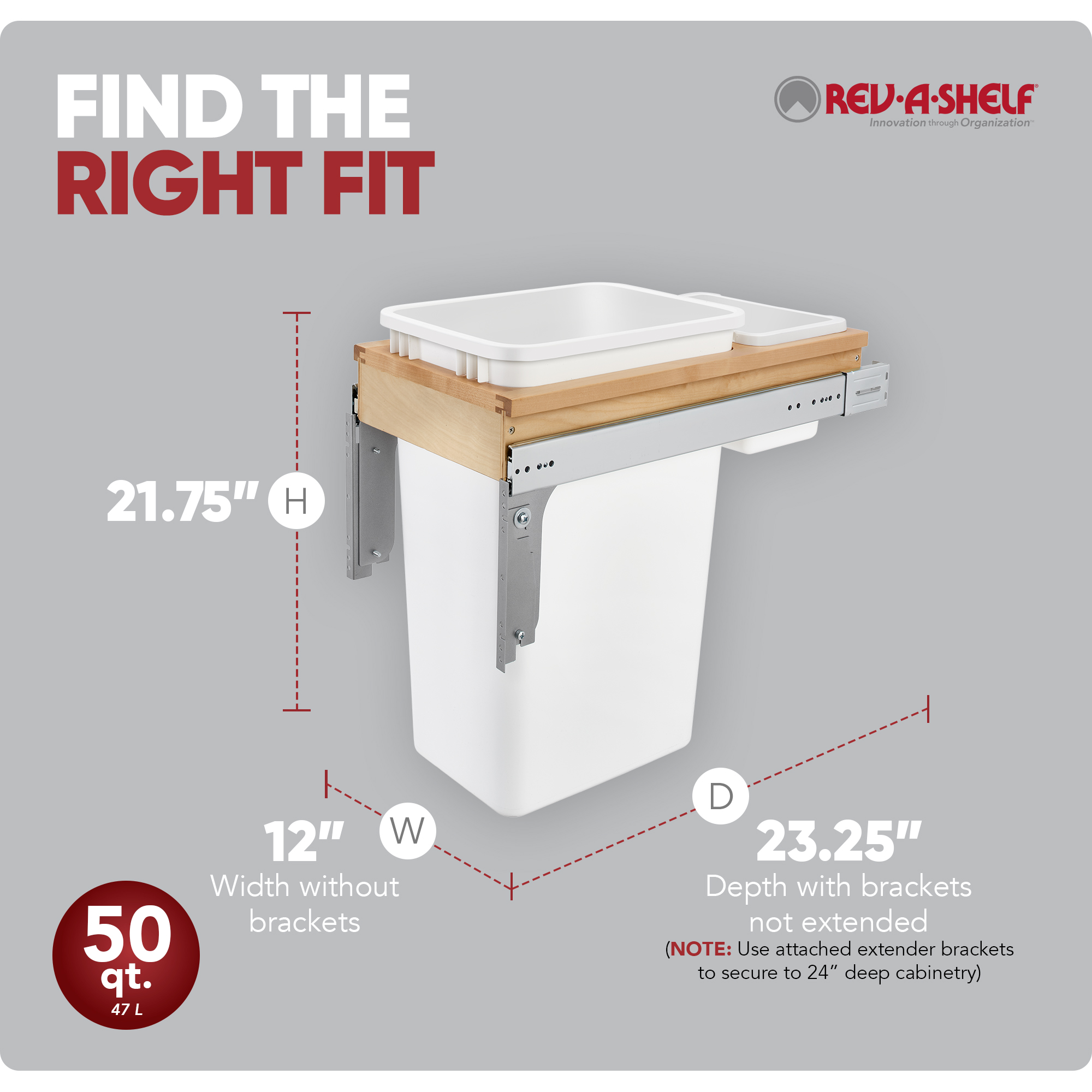 Only one pullout trash container series has stood the test of time and that is Rev-A-Shelf® Top Mount Series Waste Containers. The Top Mount series features beautiful fully assembled dovetail wood construction and full-extension slides for total access and easy removal of your trash bins. All the top mount series also includes a 4-way adjustable door mount bracket that will finish off your installation by attaching your own cabinet door for easy operation. It’s available in various widths, depths and heights for your specific cabinet application.