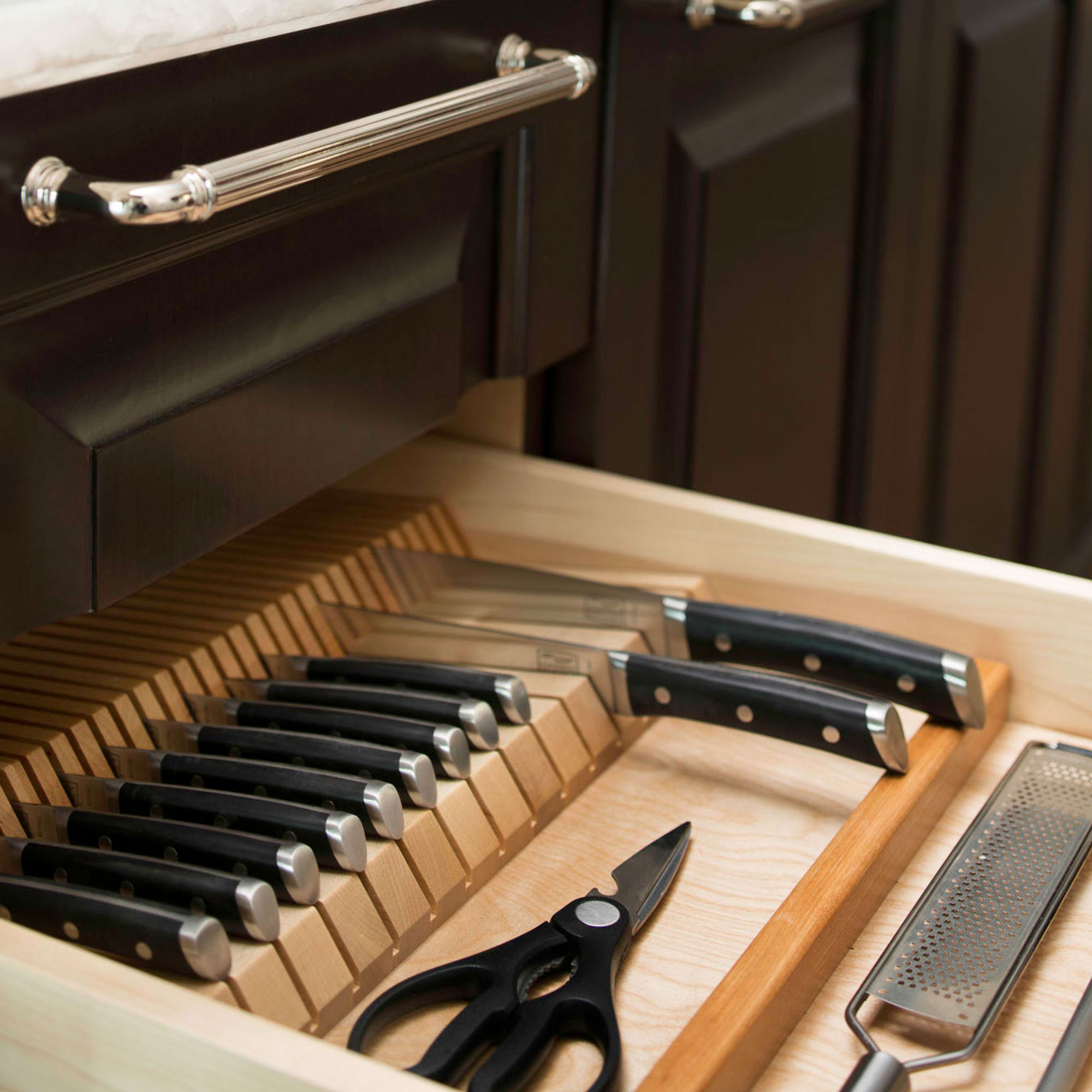 Never run out of space for your kitchen utensils ever again and organize with style with the Double Knife Block Drawer Insert from Rev-A-Shelf.