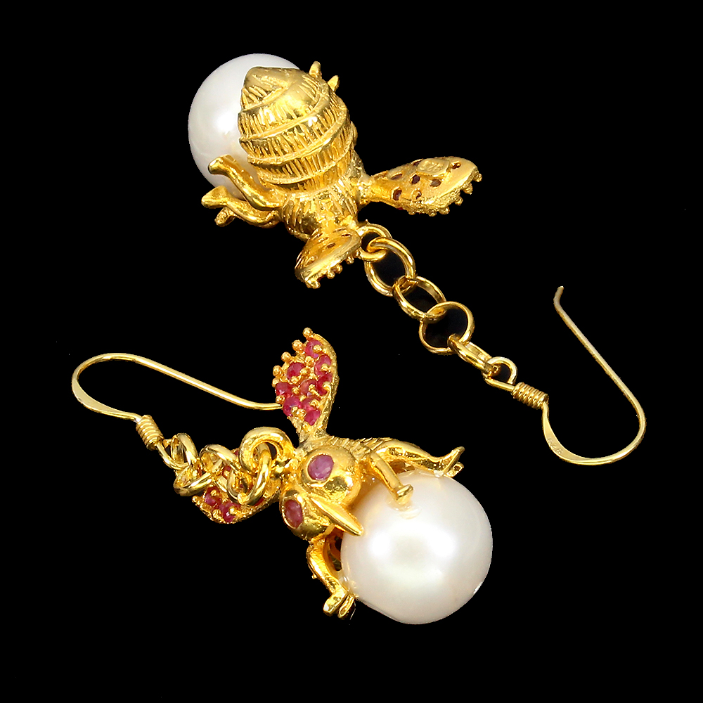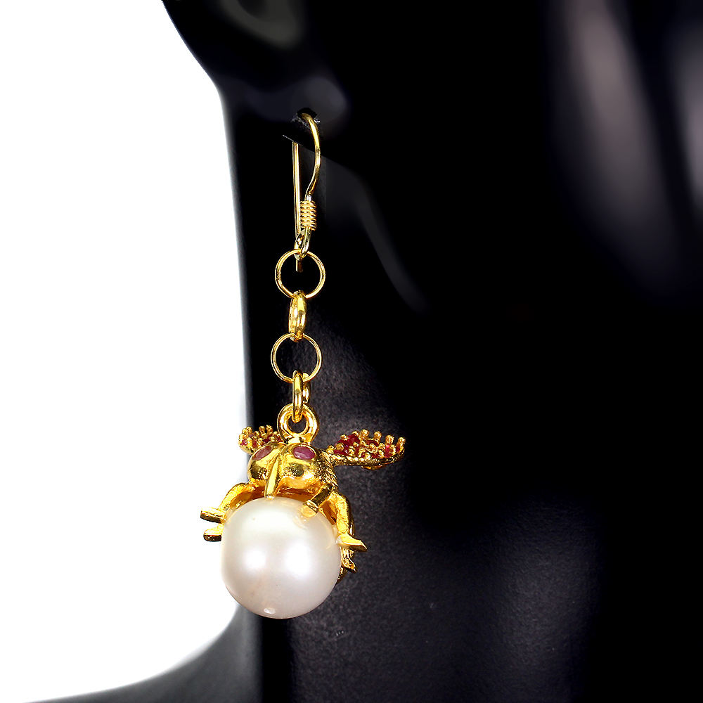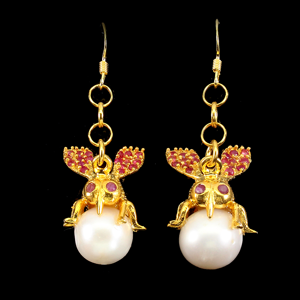 Baroque Creamy White Pearl 12x10mm Emerald Ruby 925 Sterling Silver Bee Earrings
