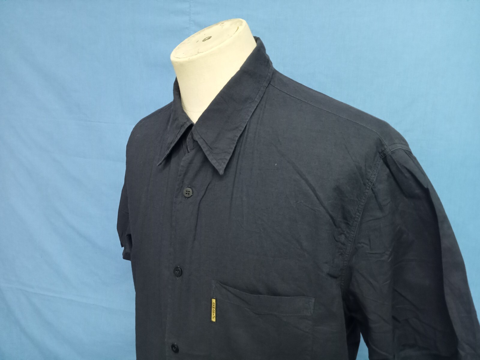 Awesome vintage ARMANI JEANS navy blue silky cotton thin & soft men's casual shirt authenticity guaranteed. Check out awesome uséd designer shirt short sleeves with buttons front. The shirt has point collar single pocket with patch ARMANI J. on left chest 7 buttons closure on front. The color is navy blue solid pattern. Fabric is 100% cotton thin and soft. The item is pre-owned still in flaw condition. There has one tiny hole above pocket on left chest. It has already laundered clean and fresh ready to wear. Don't miss out awesome designer shirt.