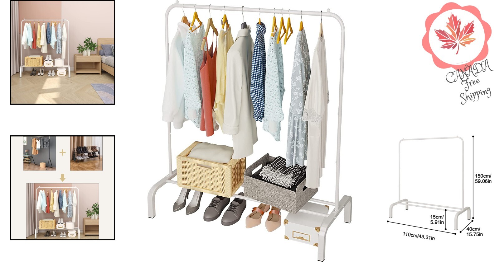 Sturdy White Clothes Rack with Shelf - 43.3 Inches - Durable, Easy Assembly