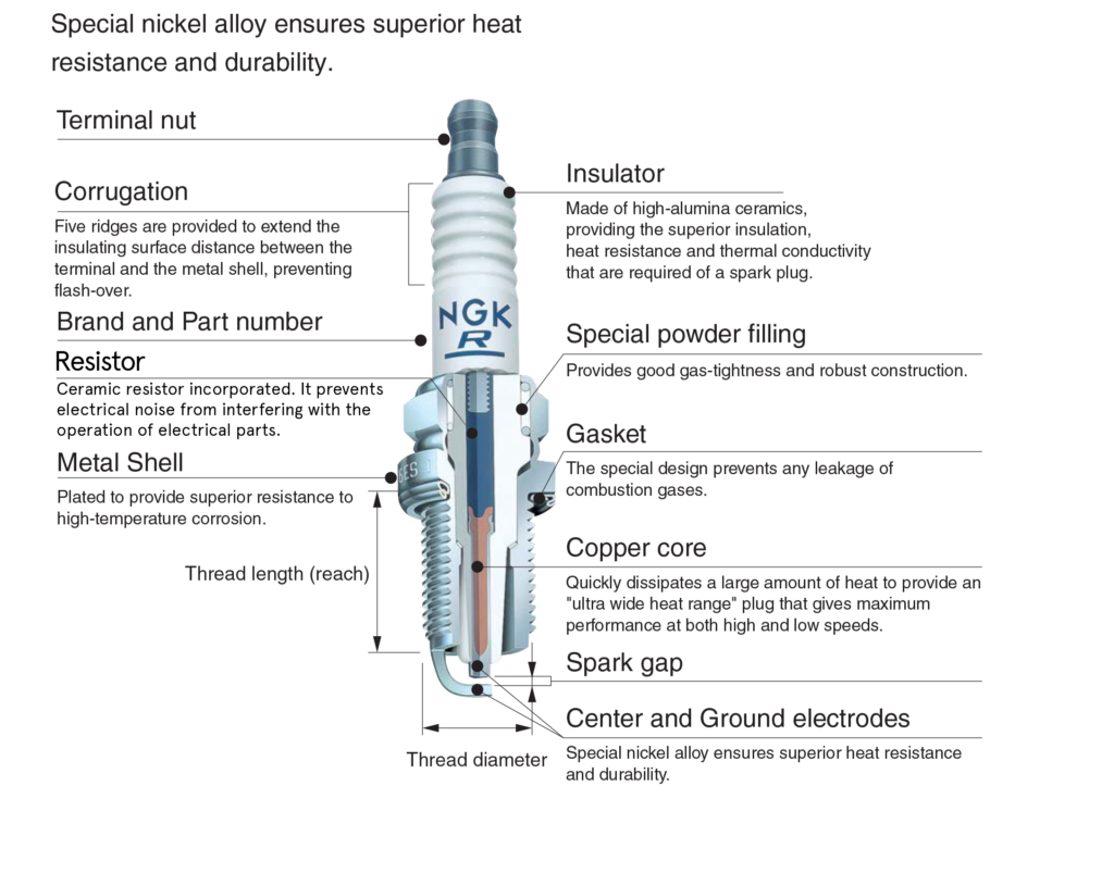 NGK nickel spark plugs feature a specially designed v-groove center electrode, improving ignitability and reducing quenching. The 98% pure copper core delivers increased heat dissipation for more reliable starts and reduced risk of overheating.
