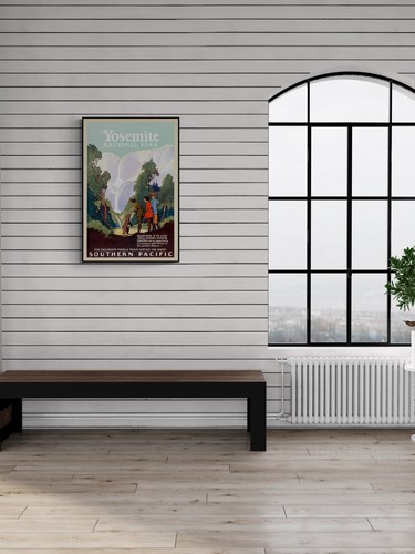 This great Vintage Style Travel Poster shows two female and a male hikers in a clearing feeding a bear cub. Yosemite Falls is in the background.