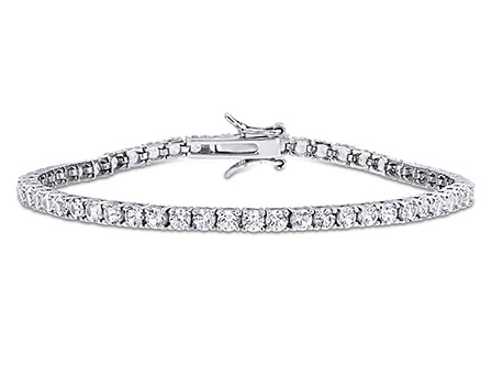 Give yourself a glamorous look when you wear this enchanting Created White Sapphire Tennis Bracelet. Crafted in lustrous sterling silver, it features round-cut created white sapphire gemstones resting in a line, creating an elegant look. Enhanced with a high polish finish, this classic bracelet is 7-inches long and comfortably secures with a pressure tongue clasp. Simultaneously subtle and alluring, evoke the envy of others wherever you go with this glittering created white sapphire bracelet.